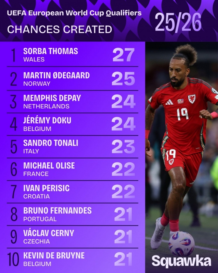直播吧11月20日讯本届世欧预小组赛已经告一段落,squakwa也统计了本届赛事创造机会情况,多位名将在列。
