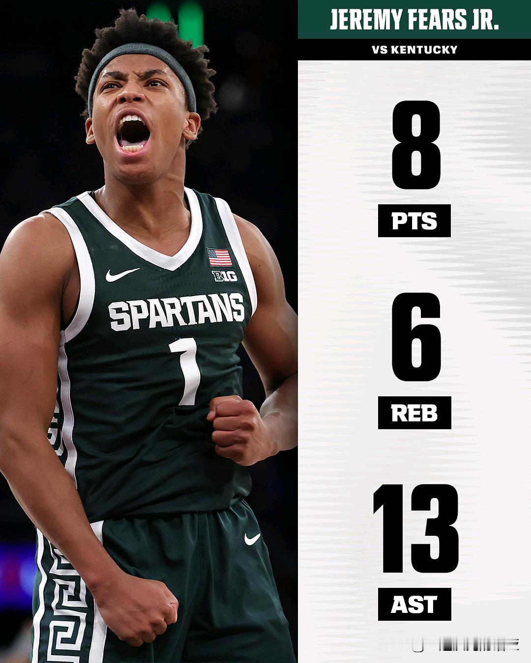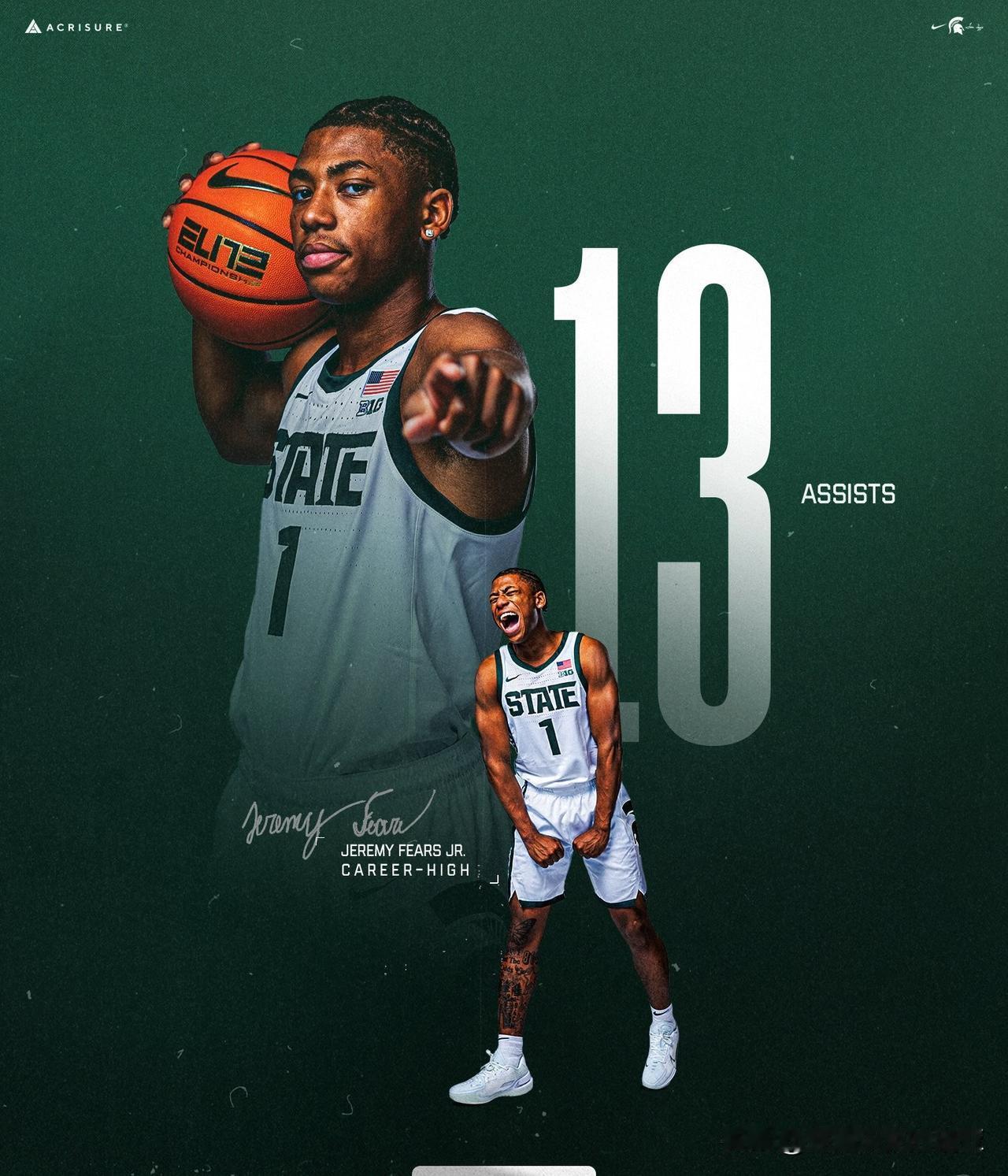 Jeremy Fears Jr单场13次助攻,密歇根州立队史常规赛对阵美联社TOP25球队时单场助攻最多的一次,目前是NCAA助攻王,主帅Tom Izzo赛后谈到球员培养,表示你和他们同舟共济,他们也会和你同舟共济,菲尔斯是一个很好的例子,他们对我的忠诚必须得到我对他们忠诚的回报,忠诚仍然很重要。