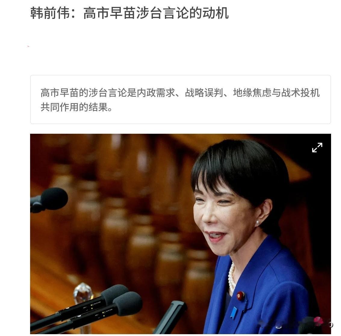 外媒表示,高市早苗的言论绝非外交失言,高市早苗明显低估了中国在台湾问题上的立场!11月20日,联合早报援引专家观点表示,在中美关系因在韩国的会谈出现阶段性缓和态势之际,日本首相高市早苗仍选择高调发表涉台言论。这一行为并非简单的外交失言,而是日本国内经济衰退、养老金改革迟滞、能源成本攀升等民生挑战加剧,意图通过外部安全议题转移国内舆论焦点,以此塑造执政合法性。 但是,问题在于高市早苗完全低估了中国大陆在台湾问题上的政策底线韧性。尽管中美关系近期显现管控竞争的意愿,但台湾问题涉及中国核心主权利益,根本不存在妥协空间。高市对日美同盟的依赖性评估可能存在偏差。她试图通过主动“挺台”提升日本在美国印太战略中的议价能力,却完全未充分意识到美国当前优先目标,是避免台海局势彻底失控,而非鼓励盟友采取激进立场。 因此,当下高市早苗不得不面临一种尴尬的境地,一方面不得不面对来自于中国的高强度施压,另一方面,高市早苗背后是一个失声的美国。对于联合早报这一观点我们怎么看呢?无疑,这样的观点非常的有道理。说白了,高市早苗的执政逻辑还是当年日本军国主义的那一套,那就是面对内部危机,无力应对,继而妄图通过外部事件转移矛盾。但是,高市早苗完全错估了形势。 今天的中国不是1894年的清政府,也不是蒋介石领导下积贫积弱的旧中国。高市早苗完全低估了中国对于事态的判断,也低估了我们的实力。高市早苗以为挑衅行动将很快以外交抗议结束,但结果是,我们对于让军国主义冒头的高市早苗采取了猛攻狠打的态势,一点都没有松动的迹象。这说明什么呢?这说明我们对于高市早苗的挑衅早有预案,我们做好了其挑衅的准备。 中美博弈,高市早苗天真的以为美国会挺日本,结果却是美国根本不吭声。特朗普看起来说话口无遮拦,但是在台湾问题上,特朗普比谁都谨慎,这恐怕是高市早苗始料未及的。这其实说明特朗普虽然看起来霸道,但是对于局势的认知远超高市早苗。中美已经面对面交过手,对于中国的实力,美国没有任何的误判,高市早苗的行为,出于其精明的算计,但结果看不清自己,只能是自讨苦吃。