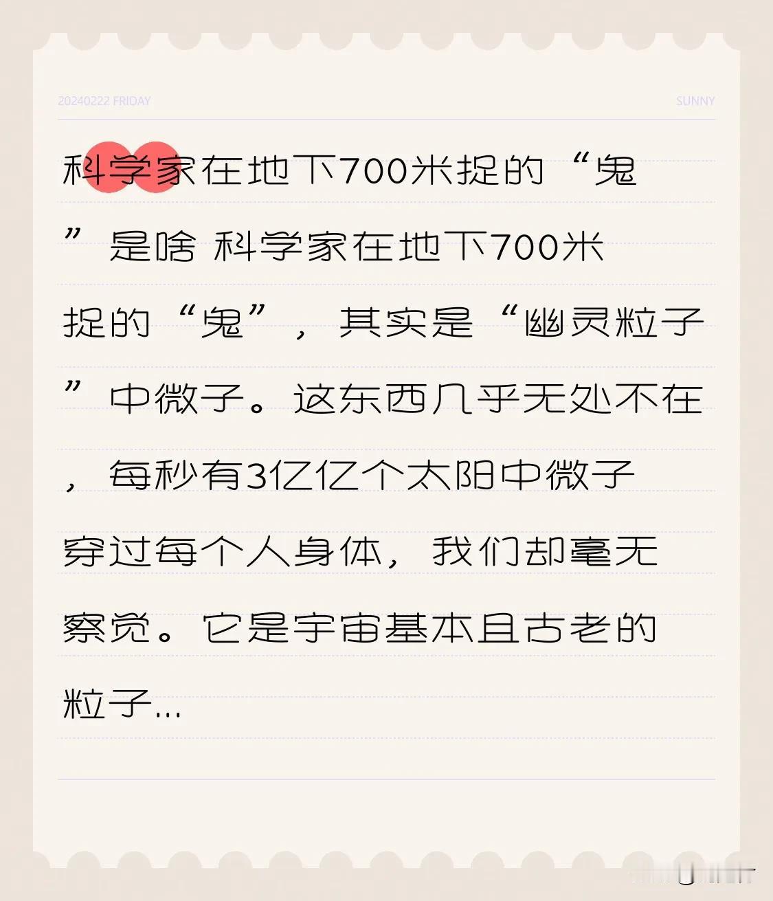 科学家在地下700米捉的“鬼”是啥 科学家在地下700米捉的“鬼”是什么?其实是“幽灵粒子”中微子。这一粒子几乎无处不在,每秒有3亿亿个太阳中微子穿过每个人的身体,我们却毫无察觉。它是宇宙中基本且古老的粒子,每立方厘米约有300个残留的宇宙大爆炸中微子。 中微子以接近光速运动,穿透能力超强,极难被探测。比如,穿过直径约12700多公里的地球,100亿个中微子可能才被截住一个。在中国广东江门地下700米处,科学家建造了大“玻璃球”来捕捉它。最近,江门中微子实验取得重大成果,测量中微子振荡参数的精度大幅提高,让确定中微子质量顺序更进一步。 中微粒子探测器 粒子源 鬼粒子 幽灵粒子 中微子实验