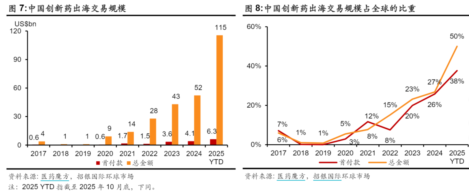 2)中国创新药出海交易在25年进一步爆发。今年前10个月,本土创新药出海总交易金额和首付款占全球同期交易规模的38%和50%,显著高于2020年的5%和3%。