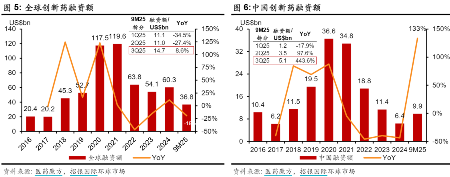 3)中国创新药出海热潮驱动国内创新药融资额复苏。中国3Q25创新药融资同比大增443.6%。此外,全球创新药融资在降息背景下逐步企稳,3Q25同比增长8.6%。随着中国创新能力在全球认可度提高,预计国内创新药融资将恢复健康增长。