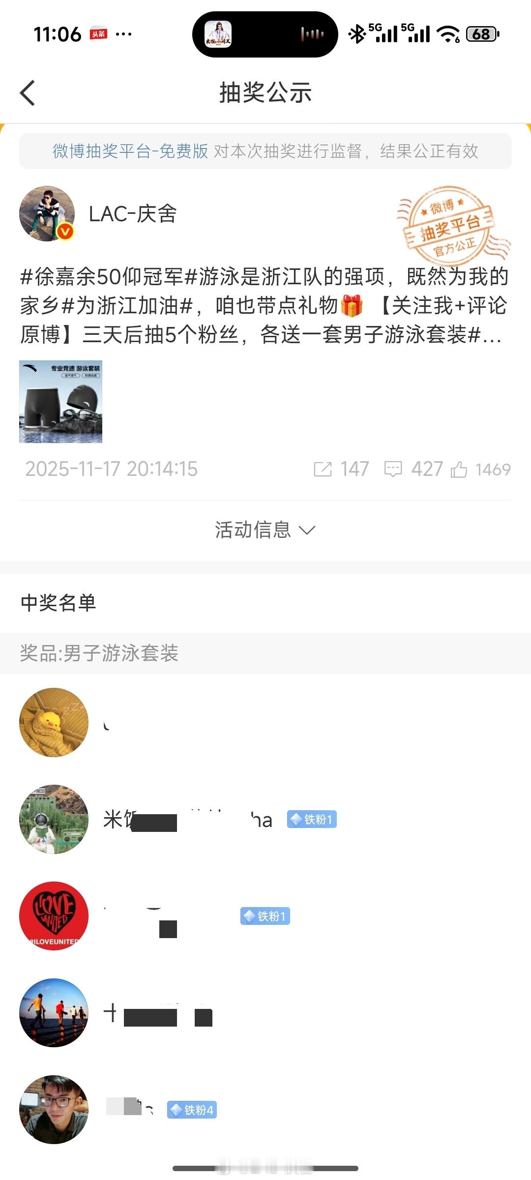 全运会 为家乡健儿打call抽奖,选了游泳套装作为奖品,就是期待大家多参与运动。没想到这次抽奖能抽中一位游泳教练,真的是美好的幸运!