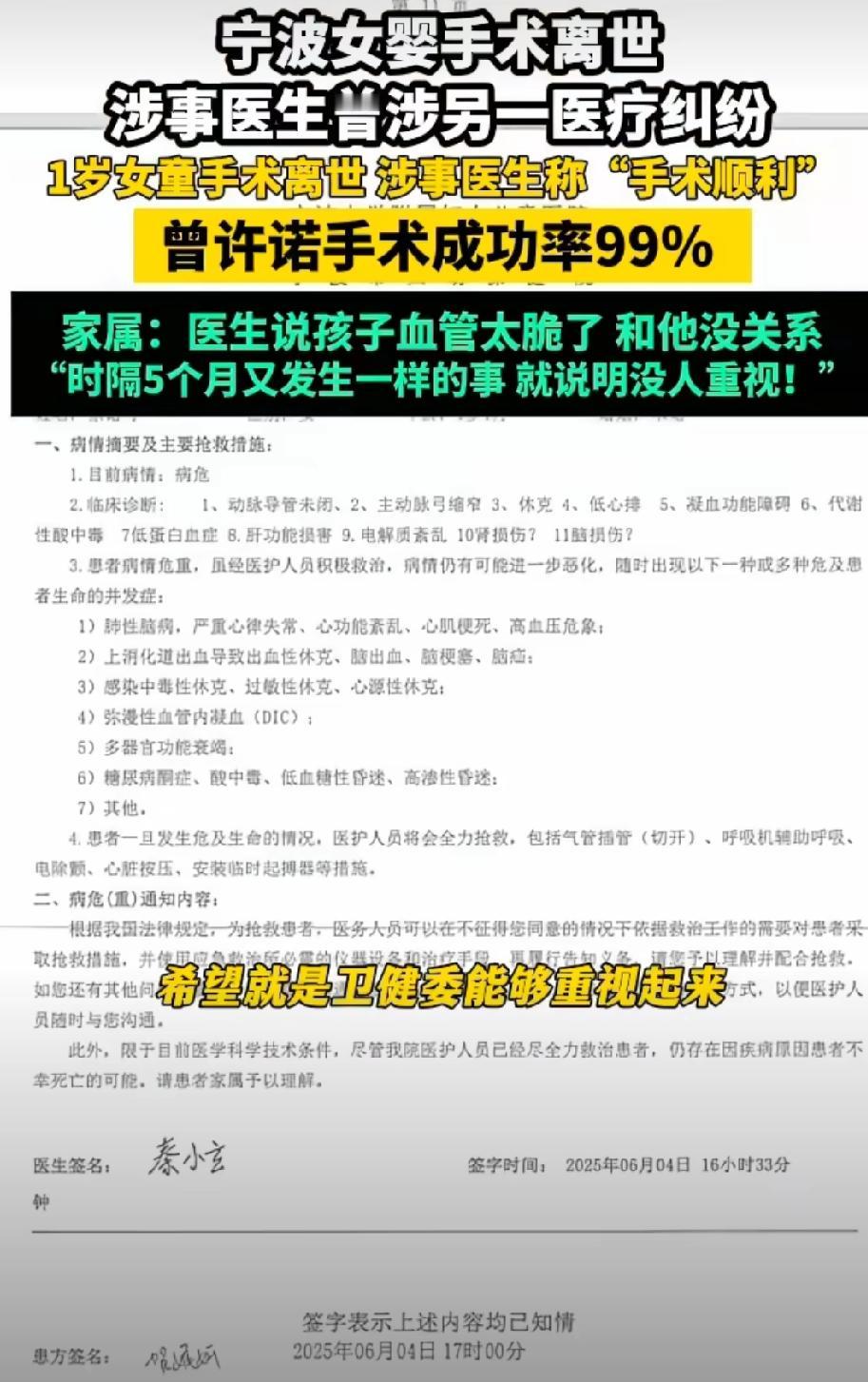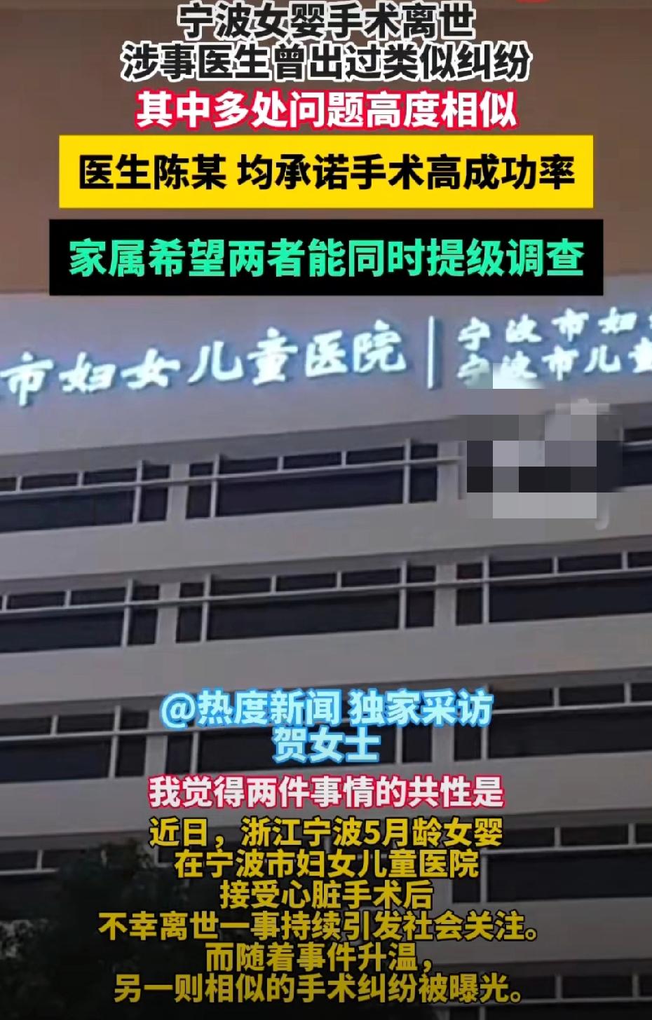 女婴术后离世,主治医生被爆涉及另一纠纷。 近日,在浙江宁波,5个月大的女婴在宁波市妇女儿童医院做完心脏手术后不幸离世。这一事件受到广大网友的关注。伴随着事情的发展,另一起较为相似的术后死亡事件也被曝光。 涉事医生陈某,在2025年6月4日,已经有过一起类似的术后死亡案件纠纷,13个月大的婴儿,在此医院接受手术后死亡,主刀医生与这次五个月大女婴涉事医生同为医生陈某。 婴儿家属贺女士称,做手术前医生陈某承诺手术成功率99%,然而孩子从进入手术室到手术结束,经历了8个小时,并在术后三个小时宣告孩子死亡。事后贺女士多次向相关部门举报投诉,并未得到相应的回复和补偿。医院方面表示,主刀医生陈某是有着丰富经验的资深医生,目前没有任何证据可以证实婴儿死亡是陈某在手术中存在工作失误导致婴儿死亡。 现在又一起相似的事件,两起事件仅相隔5个月,贺女士表明,这是对患者的不重视,这是医院对婴儿死亡事件的不重视,同时也说明地方卫健委以及相关领导没有重视。希望各级部门可以严查这起事件,还死者父母一个公平,谁该承担责任,谁的过错应该付出相应的惩罚。还两个不幸的婴儿一个公道。 两个刚来到这个世界的孩子,还没好好看一看这世界的美好,就在手术后离世,这是何等的可惜。更让人气愤的是同一个医生五个月没,两起术后死亡事件,医院不仅不处理涉事医生还为其找借口开脱。