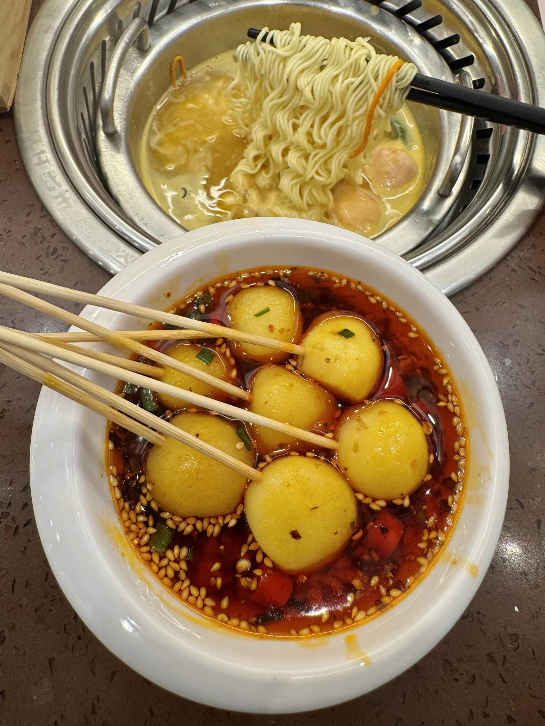 饭点好多人啊啊啊啊啊😭😭😭 自选模式 串串坠低1r1串!!真实现火锅自由了! 牛肉、珍珠小土豆、鲍鱼、黑豆花,各种美味丸子…尊的很好吃!宝藏小店➕11111一个人来吃也可以!!y
