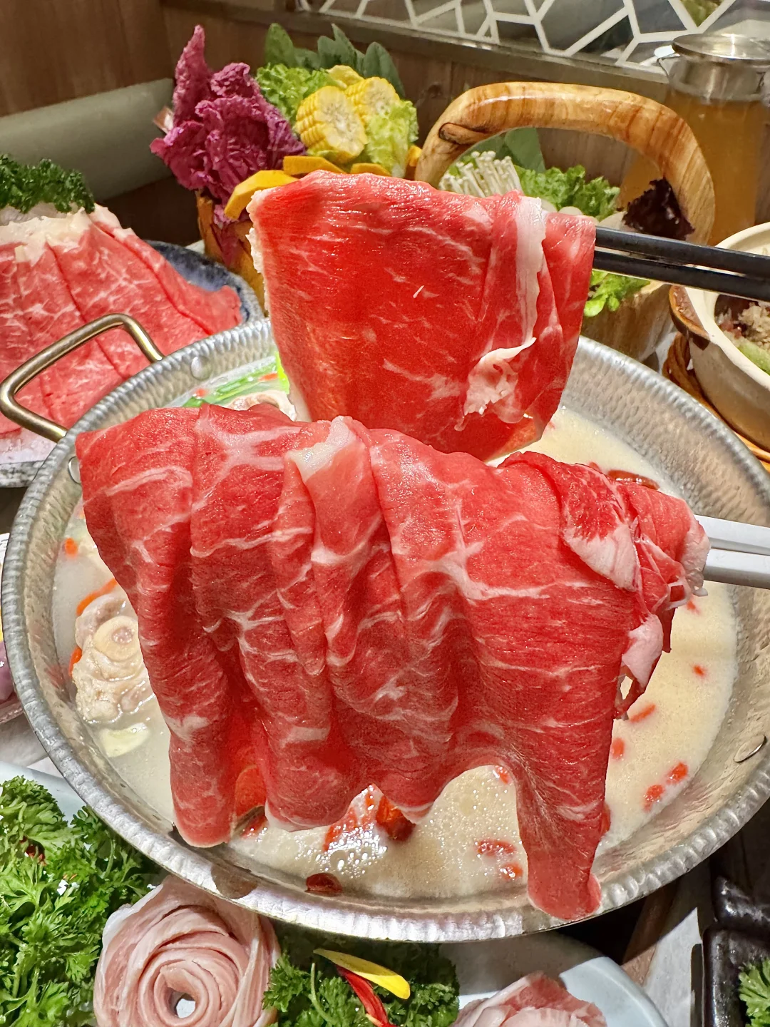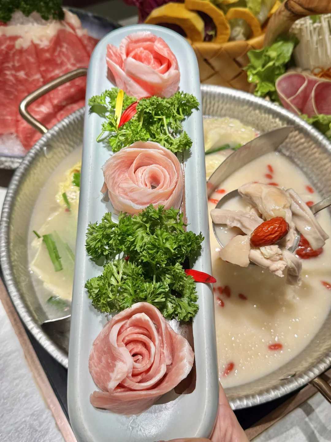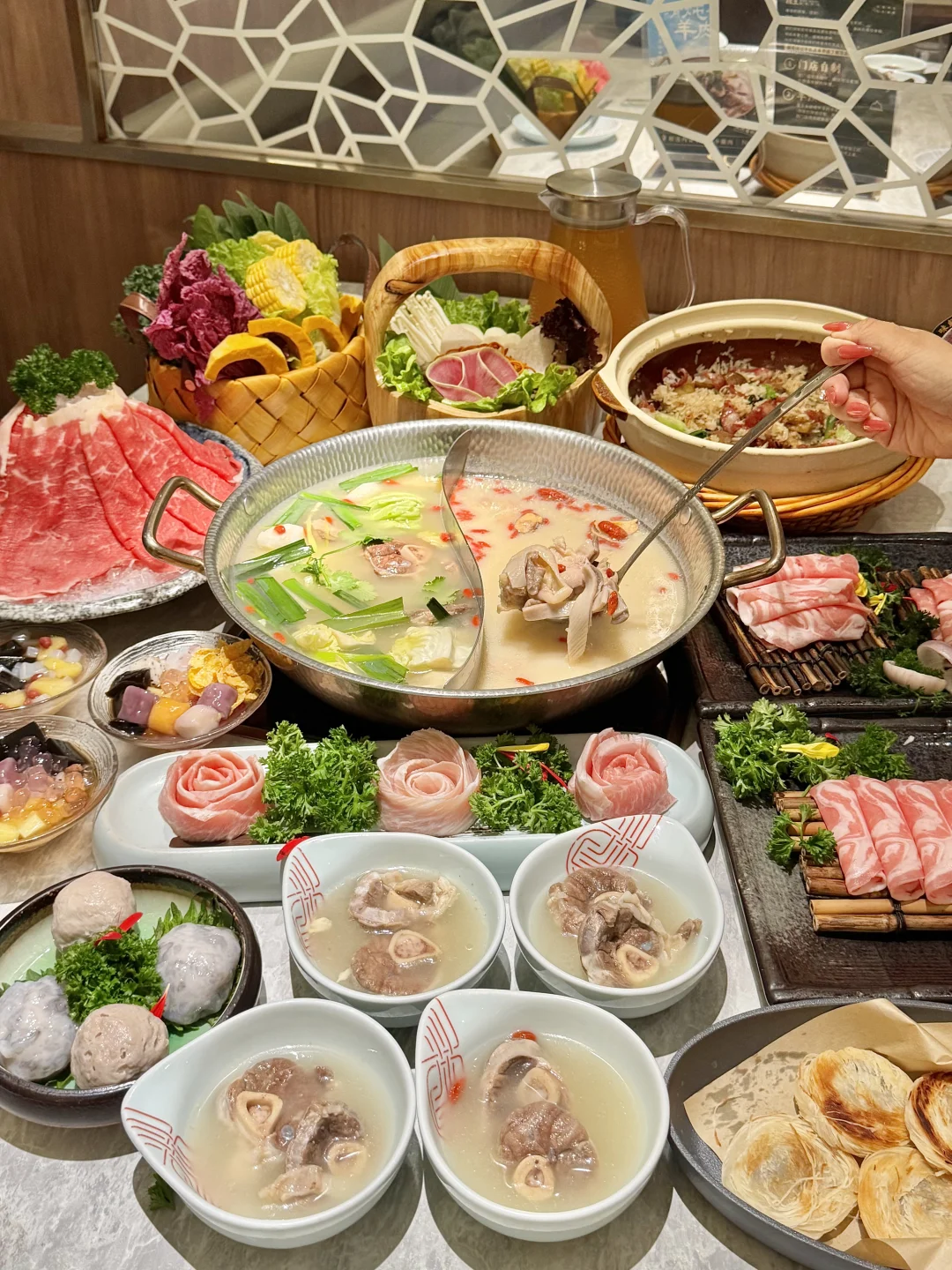 一周连吃3次的!!直接把我香到说不出话🤤🤤 推荐清炖竹蔗羊肉和胡椒猪肚鸡锅底双拼~ 猪肚鸡汤底🤤 鲜嫩的鸡肉和Q弹的猪肚,鲜香味美!我连喝好几碗汤!! 羊肉煲汤底一大锅羊排肉炖到脱~骨,内蒙古生长周期一年内的小羔羊羊腿肉软糯入味!嫩嫩的没有一点膻味~ 还有羊骨髓,又嫩又香一点不腻!! 杭州