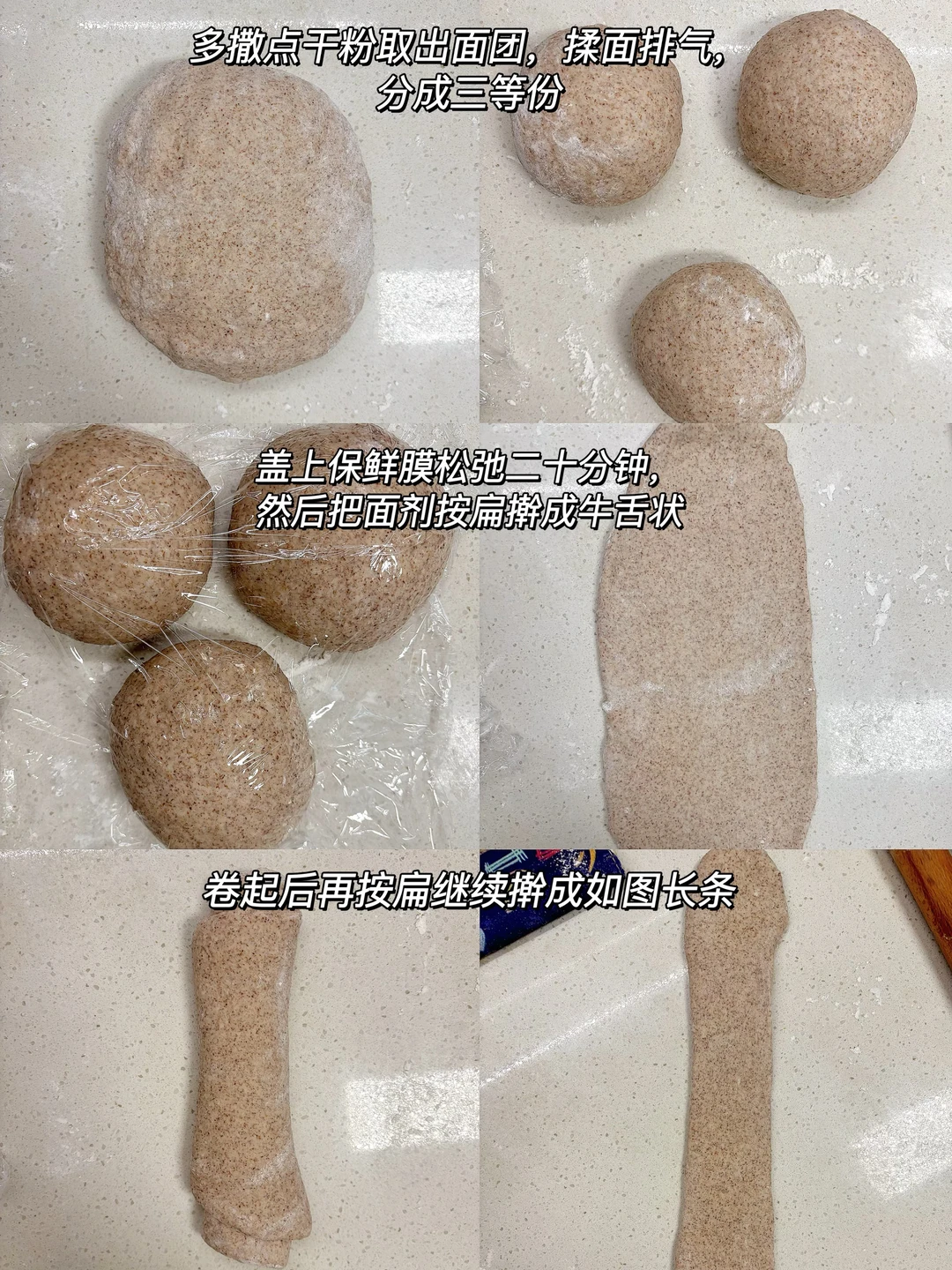 4️⃣然后把松弛好的面团按扁擀成牛舌状,卷起后再按扁继续擀成如图长条,从短的那边卷起来,不要卷的太紧;