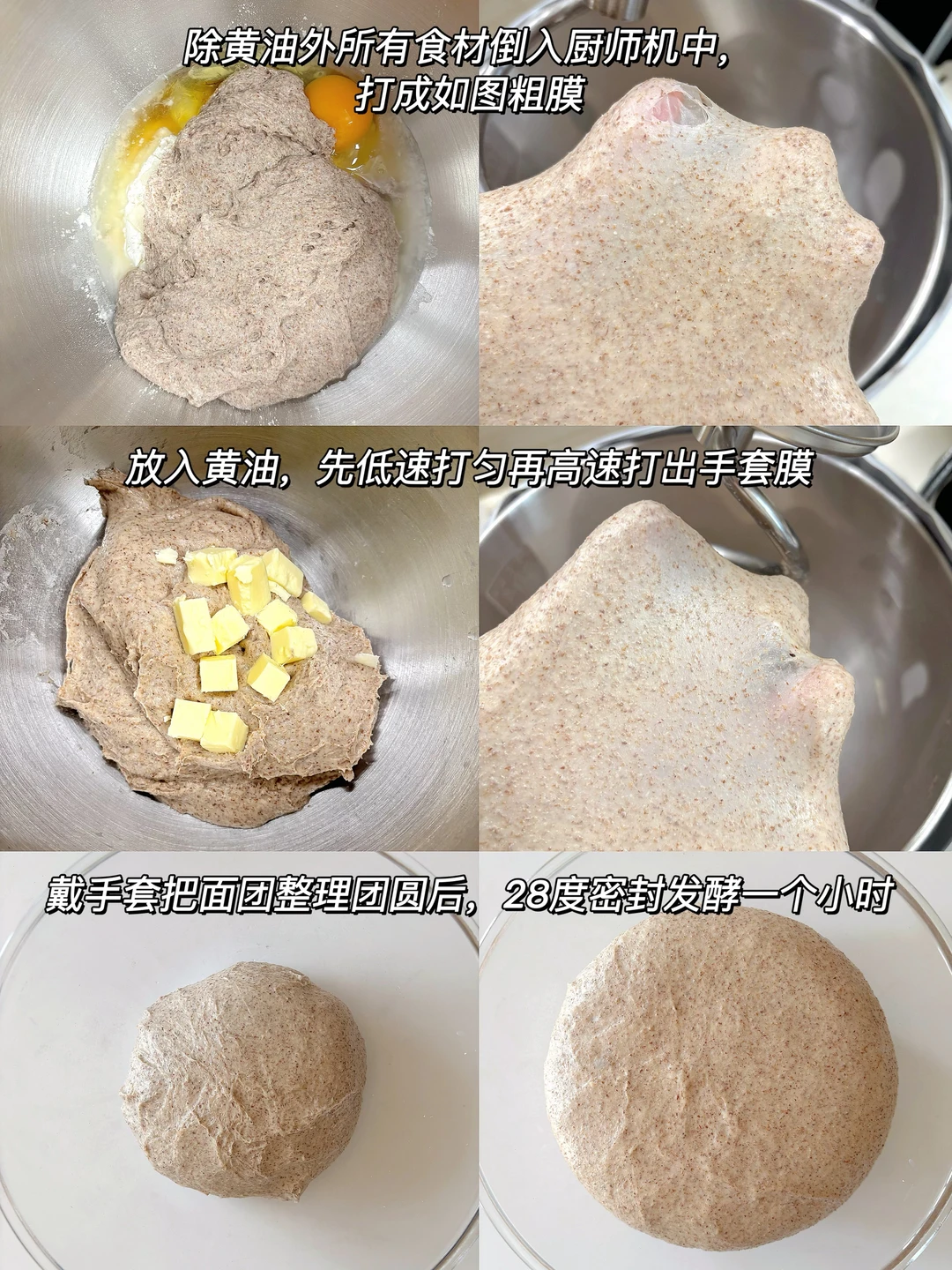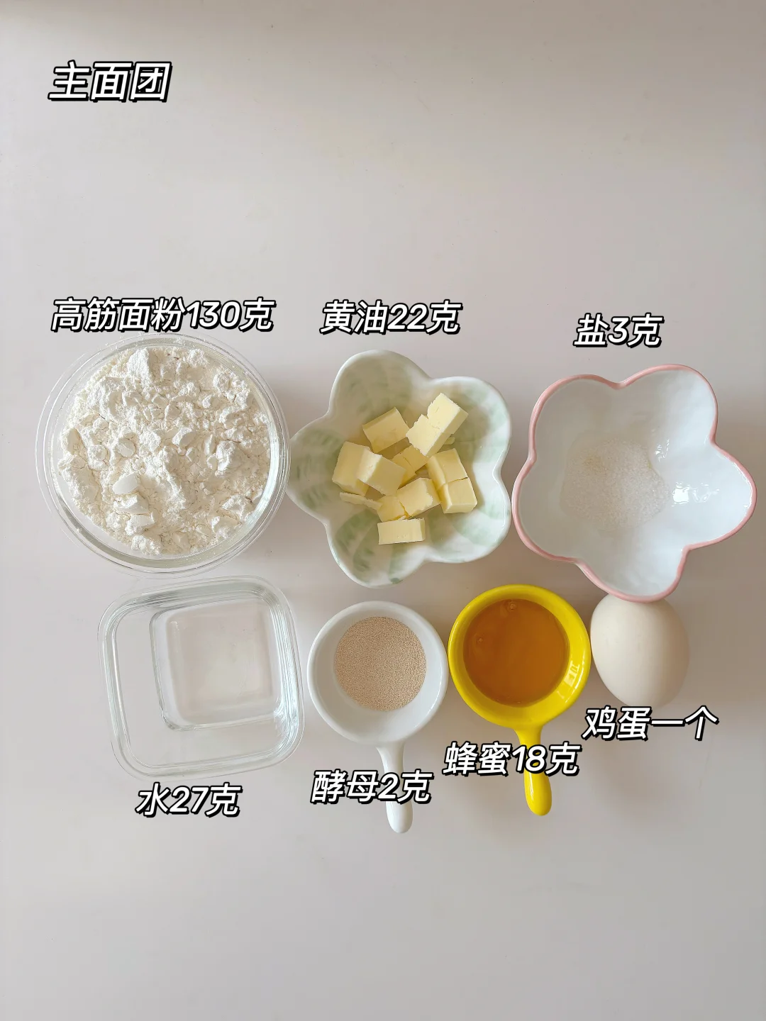 2️⃣主面团:高筋粉130克,蛋1个,蜂蜜/糖18克,盐3克,酵母2克,水27克,黄油22克;