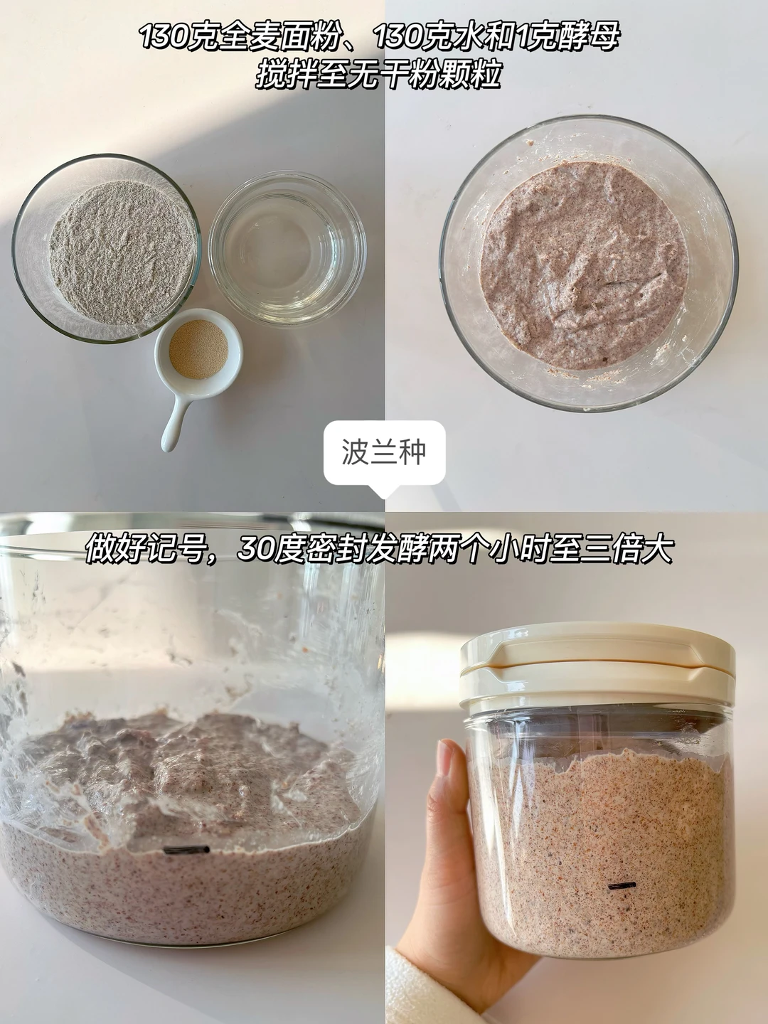 1️⃣ 全麦波兰种:全麦粉130克,水130克,酵母1克,30度发酵两个小时,发酵前做好记号,需发酵至三倍大;