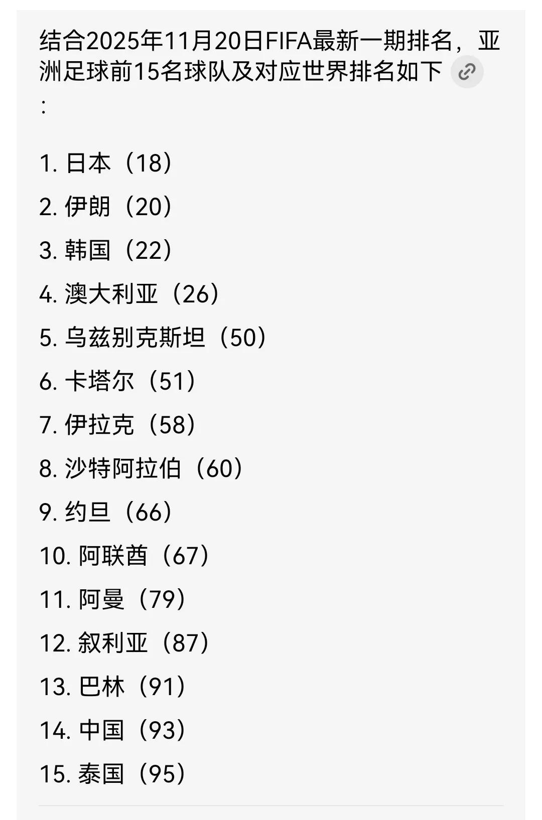 中国国足4个月不打热身赛对积分和排名反而是好事,国足世界排名依然不变,目前位列世界第93位,亚洲第14位,国足在2025年错过了9月、10月、11月这三个国际比赛日窗口期的6场热身赛机会,如果打了比赛,国足大概率输多胜少,积分肯定要变少,排名肯定还会下滑,现在好了,没打比赛积分也不变。 亚洲有多支足球队因为比赛表现不佳,反而导致世界排名下降,乌兹别克斯坦由于近期赛事中表现不佳,世界排名直接下降5位,最新位列世界第50、亚洲第5名;伊拉克也是海湾杯和世预赛表现不好,世界排名下滑至第58位、亚洲第8位;卡塔尔也是世界排名下滑7位至第55位;印度队因近期对阵新加坡等队的赛事表现低迷,世界排名下降3位至第136位,创下2016年以来的最低排名,在亚洲位列第25位;印尼队由于世预赛附加赛2连败,接连不敌沙特和伊拉克,丢掉13.21分,世界排名下降3位跌至第122位,亚洲排名23位;约旦排名下降4位,世界排名来到第66位;巴林的世界排名下降2位,最终位列第91位,亚洲13位;阿曼世界排名下降1位,保持在第79位;伊朗和澳大利亚世界排名也下降。 只有日本队较上期提升1位至世界第18位,日本11月热身赛中先后击败加纳和玻利维亚;韩国队则维持世界第22位的排名不变。 中国国足没有主帅4个月,反而对排名是大大的利好,比赛一场没有打,积分也就自然不变了,2025年4月中国国足世界排名94位,到现在中国国足世界排名93位,今年反而还上涨了1位,中国国足真的很稳定啊!