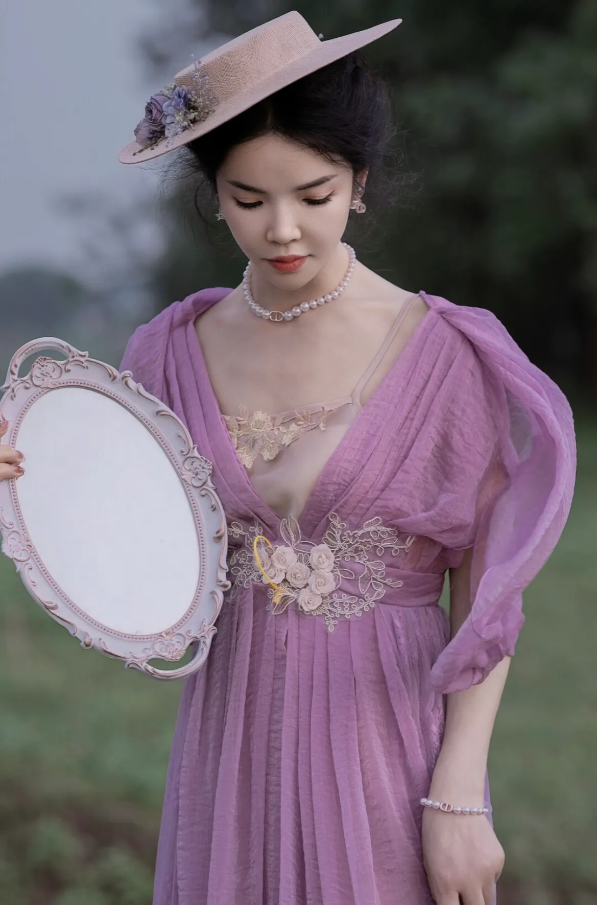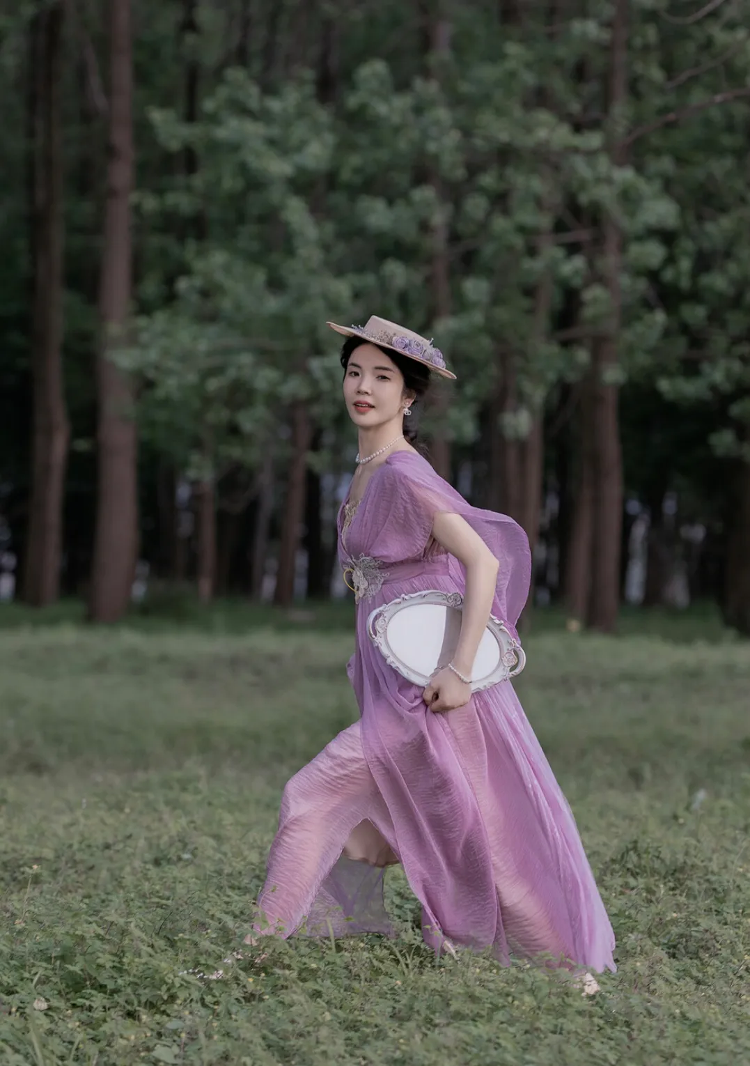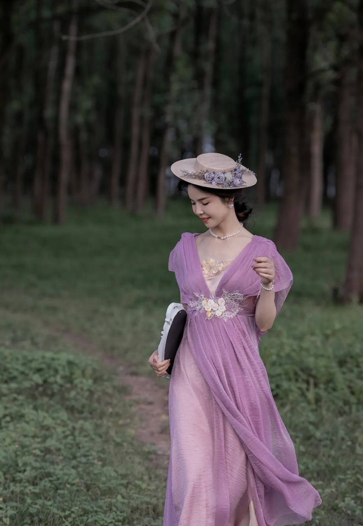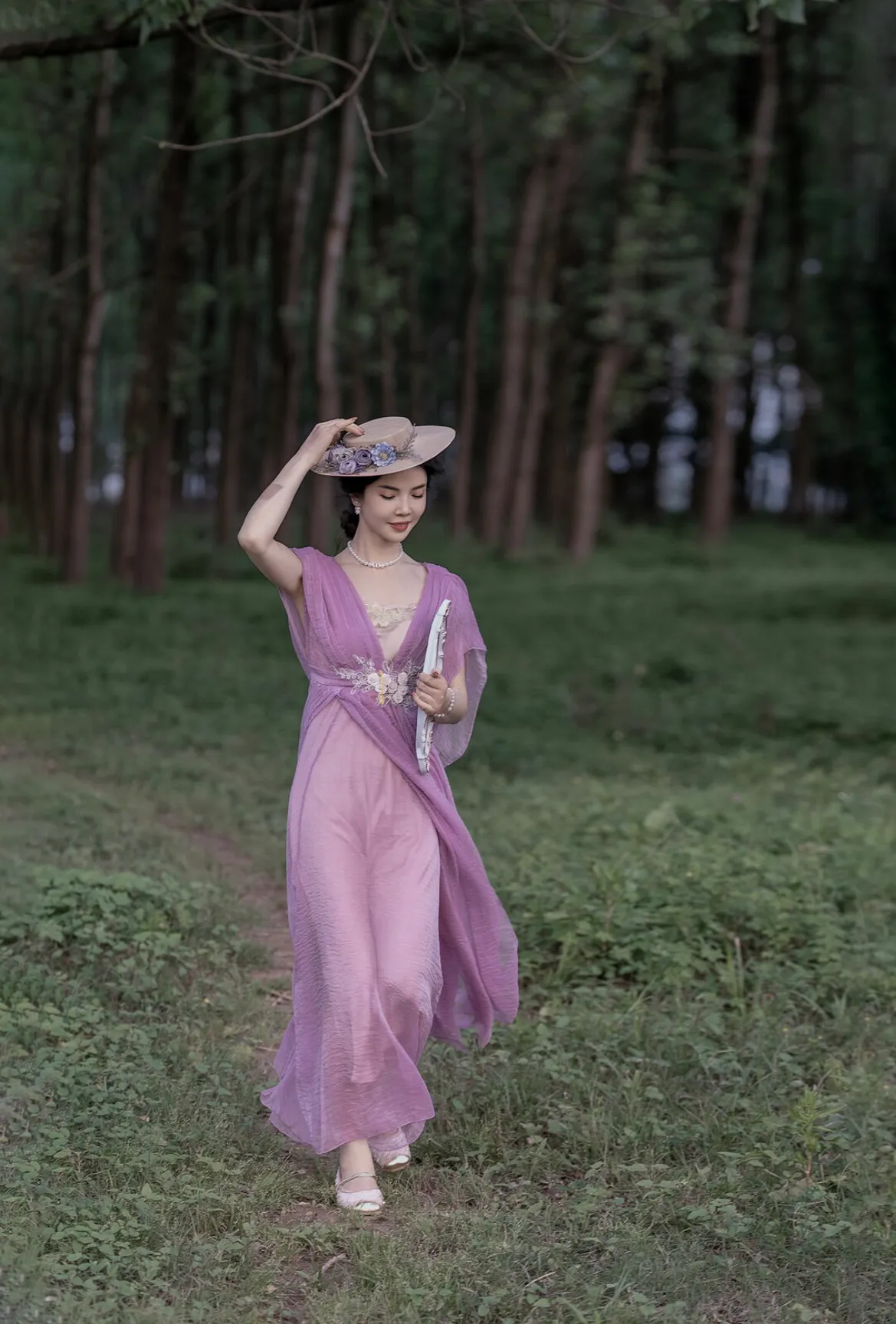 漫步森林中的优雅淑女,粉色长裙与自然风景相得益彰。