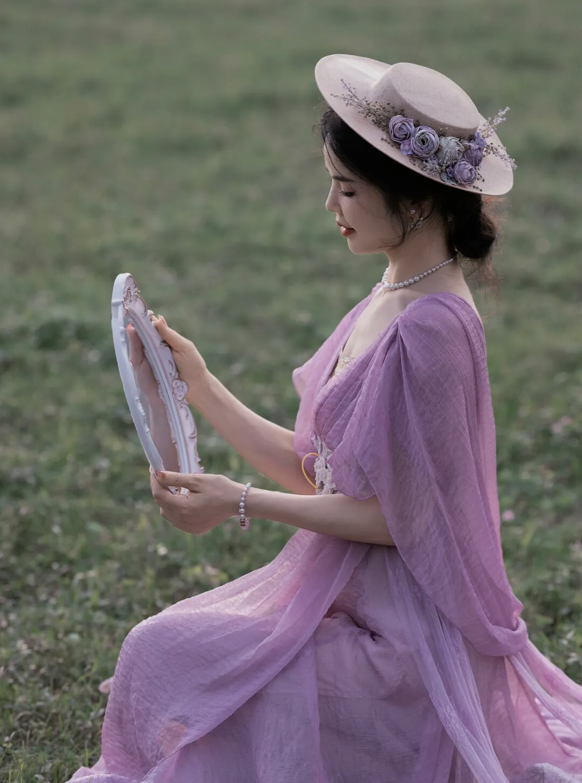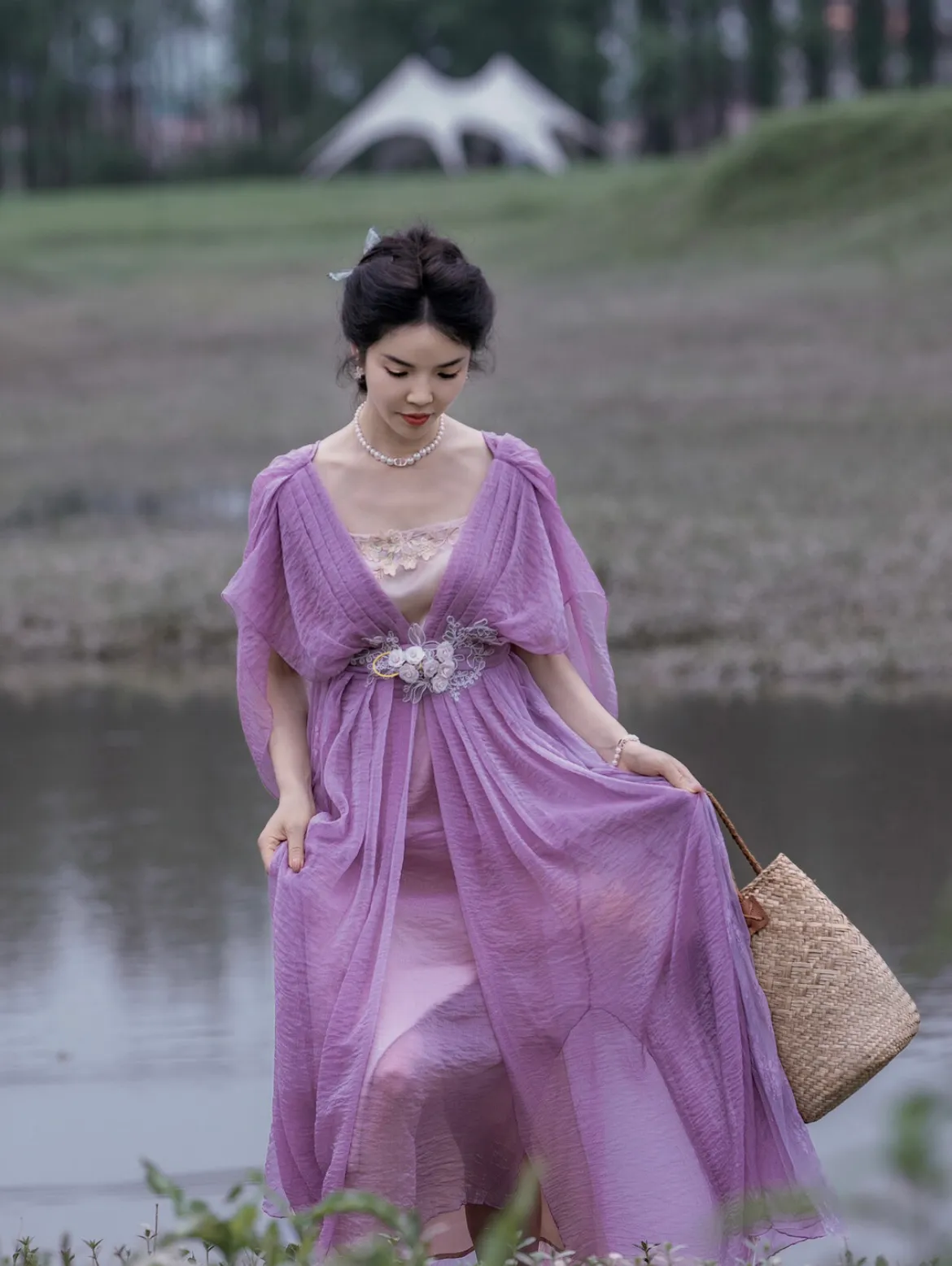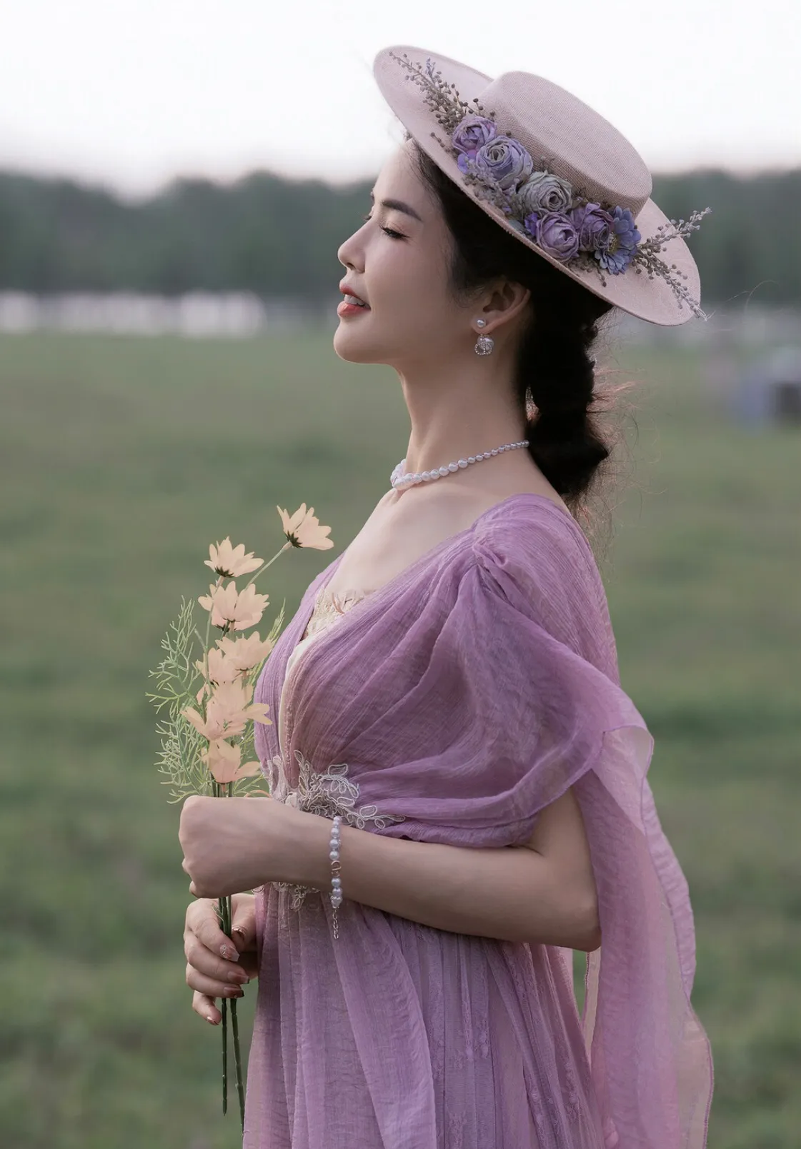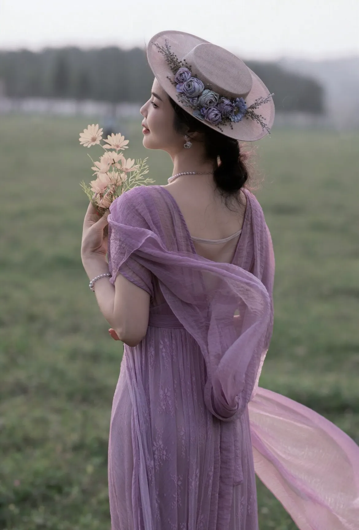 漫步森林中的优雅淑女,粉色长裙与自然风景相得益彰。