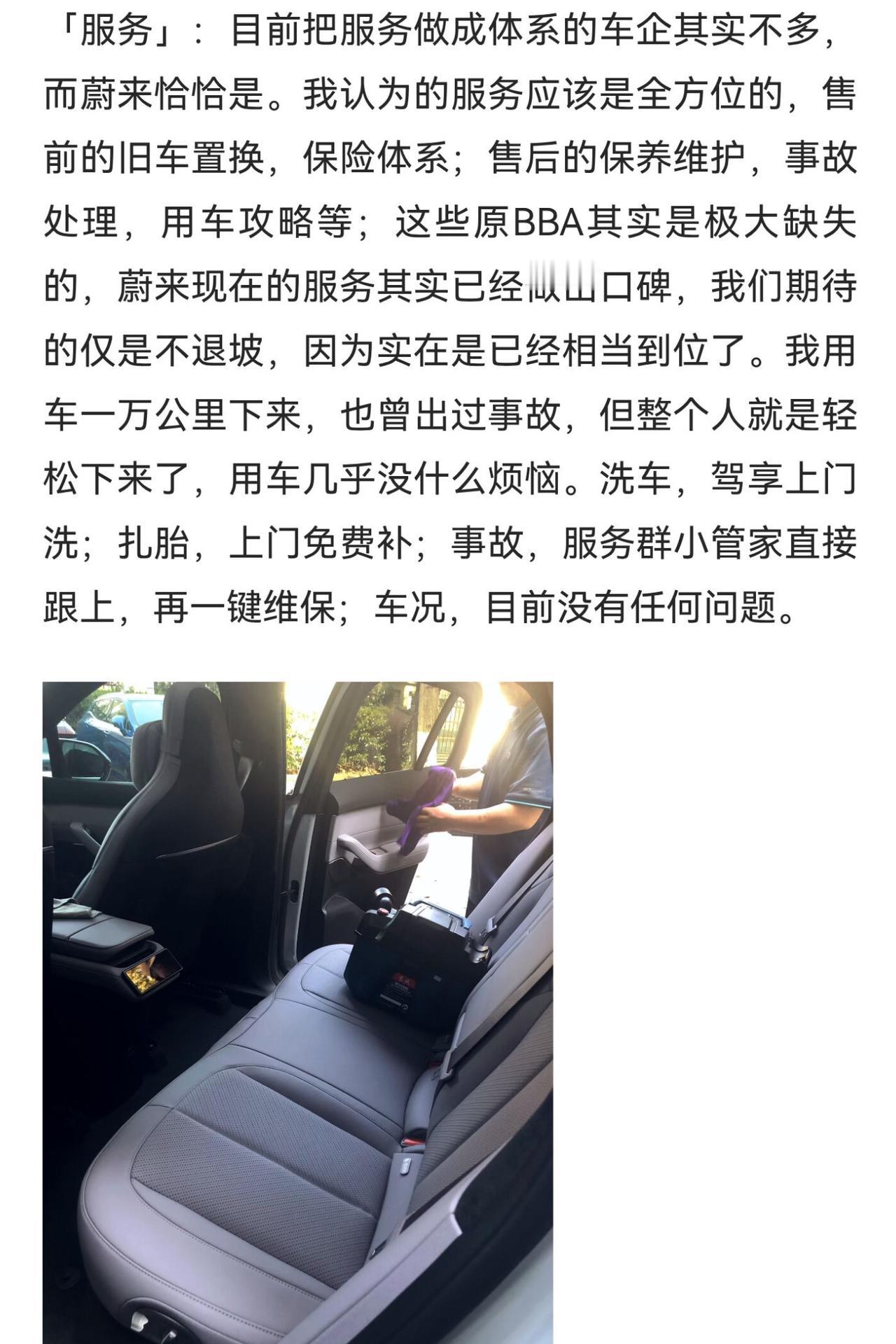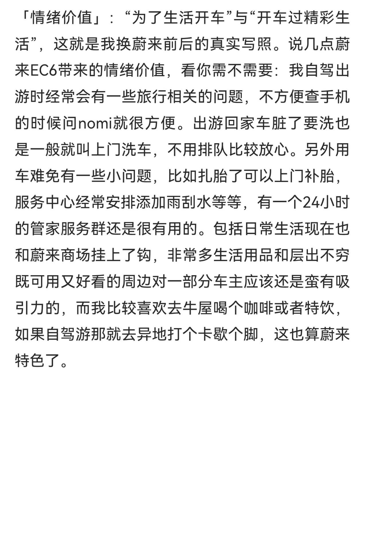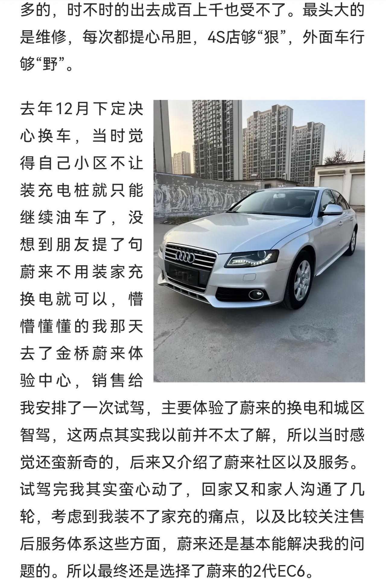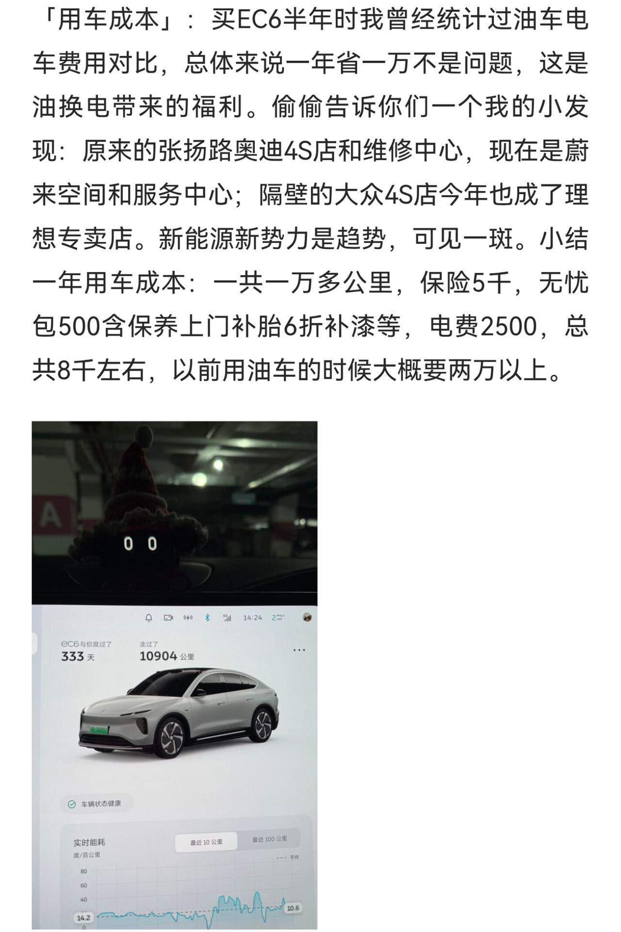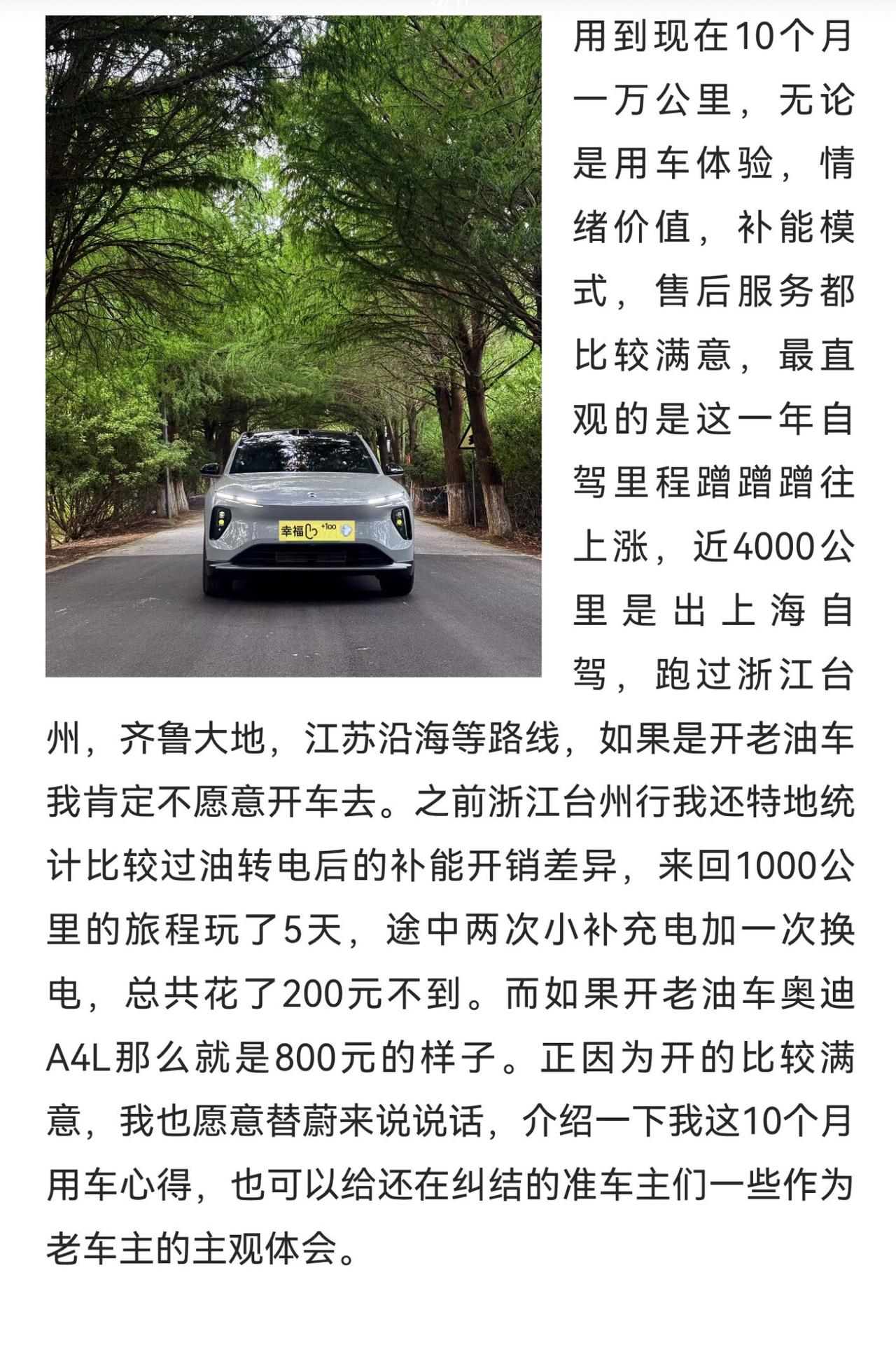 最近看到很多油转电的帖子,我也分享下我从A4L换成EC6的经历 驾龄二十多年,以前开过不少油车,陪伴最久的要属奥迪A4L了。总的来说小四也算颜值在线,操控OK,但油车的问题也实在,用车成本高,服务几乎没有,小毛病也挺多的,时不时的出去成百上千也受不了。最头大的是维修,每次都提心吊胆,4S店够“狠”,外面车行够“野”。后来用上了蔚来服务我个人感觉就是以前油车卖车后的服务缺失造成的这种窘境。去年12月下定决心换车,当时觉得自己小区不让装充电桩就只能继续油车了,没想到朋友提了句蔚来不用装家充换电就可以,懵懵懂懂的我那天去了金桥蔚来体验中心,销售给我安排了一次试驾,主要体验了蔚来的换电和城区智驾,这两点其实我以前并不太了解,所以当时感觉还蛮新奇的,后来又介绍了蔚来社区以及服务。试驾完我其实蛮心动了,回家又和家人沟通了几轮,考虑到我装不了家充的痛点,以及比较关注售后服务体系这些方面,蔚来还是基本能解决我的问题的。所以最终还是选择了蔚来的2代EC6。 用到现在10个月一万公里,无论是用车体验,情绪价值,补能模式,售后服务都比较满意,最直观的是这一年自驾里程蹭蹭蹭往上涨,近4000公里是出上海自驾,跑过浙江台州,齐鲁大地,江苏沿海等路线,如果是开老油车我肯定不愿意开车去。之前浙江台州行我还特地统计比较过油转电后的补能开销差异,来回1000公里的旅程玩了5天,途中两次小补充电加一次换电,总共花了200元不到。而如果开老油车奥迪A4L那么就是800元的样子。正因为开的比较满意,我也愿意替蔚来说说话,介绍一下我这10个月用车心得,也可以给还在纠结的准车主们一些作为老车主的主观体会。 「补能」:完美解决无法家充痛点。如果买了电车要经常去外面充电肯定难以忍受,而换电就不同了,平时通勤两周去换一下电,如果要出去旅行那就“可充可换可升级”,实际用起来也是很方便,通勤的日子缺电了我习惯一早上花个十几分钟出去换个电,上海这个时候电价比较便宜,我家附近5公里内有3个换电站,公司附近有一个,所以感觉换电还是蛮方便的。还有遇上寒冬,烈日,暴雨等特殊天气,看着别人下车插桩,这个时候感觉不下车换电真是什么都值了。 「用车成本」:买EC6半年时我曾经统计过油车电车费用对比,总体来说一年省一万不是问题,这是油换电带来的福利。偷偷告诉你们一个我的小发现:原来的张扬路奥迪4S店和维修中心,现在是蔚来空间和服务中心;隔壁的大众4S店今年也成了理想专卖店。新能源新势力是趋势,可见一斑。小结一年用车成本:一共一万多公里,保险5千,无忧包500含保养上门补胎6折补漆等,电费2500,总共8千左右,以前用油车的时候大概要两万以上。 「服务」:目前把服务做成体系的车企其实不多,而蔚来恰恰是。我认为的服务应该是全方位的,售前的旧车置换,保险体系;售后的保养维护,事故处理,用车攻略等;这些原BBA其实是极大缺失的,蔚来现在的服务其实已经做出口碑,我们期待的仅是不退坡,因为实在是已经相当到位了。我用车一万公里下来,也曾出过事故,但整个人就是轻松下来了,用车几乎没什么烦恼。洗车,驾享上门洗;扎胎,上门免费补;事故,服务群小管家直接跟上,再一键维保;车况,目前没有任何问题。 「情绪价值」:“为了生活开车”与“开车过精彩生活”,这就是我换蔚来前后的真实写照。说几点蔚来EC6带来的情绪价值,看你需不需要:我自驾出游时经常会有一些旅行相关的问题,不方便查手机的时候问nomi就很方便。出游回家车脏了要洗也是一般就叫上门洗车,不用排队比较放心。另外用车难免有一些小问题,比如扎胎了可以上门补胎,服务中心经常安排添加雨刮水等等,有一个24小时的管家服务群还是很有用的。包括日常生活现在也和蔚来商场挂上了钩,非常多生活用品和层出不穷既可用又好看的周边对一部分车主应该还是蛮有吸引力的,而我比较喜欢去牛屋喝个咖啡或者特饮,如果自驾游那就去异地打个卡歇个脚,这也算蔚来特色了。 「不足之处」:我的24款的75度EC6续航能力略显不足,虽然官方新的5566现在都已标配100度长续航电池,但毕竟没法惠及以前的型号,期待以后能够提供75度平滑过度到100的优惠方案,现在也能升就是性价比不太够。此外,城区智驾还需再努力,高速我感觉现在NWM已经很好开了;但我经常坐朋友阿维塔的华为智驾,感觉在城区阿维塔开得更聪明一些,所以还是比较期待蔚来NWM的更新更密一些。 写的有点长,真的希望有买车意向的朋友能看到,2025年了,我们买车不要再仅仅局限于交通工具了,它更是我们生活的一部分。