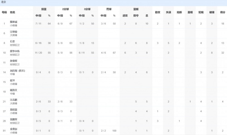 北京队方面,偰李永炜32分9篮板,隰泰诚18分10篮板2助攻,石奎13分8篮板3助攻。