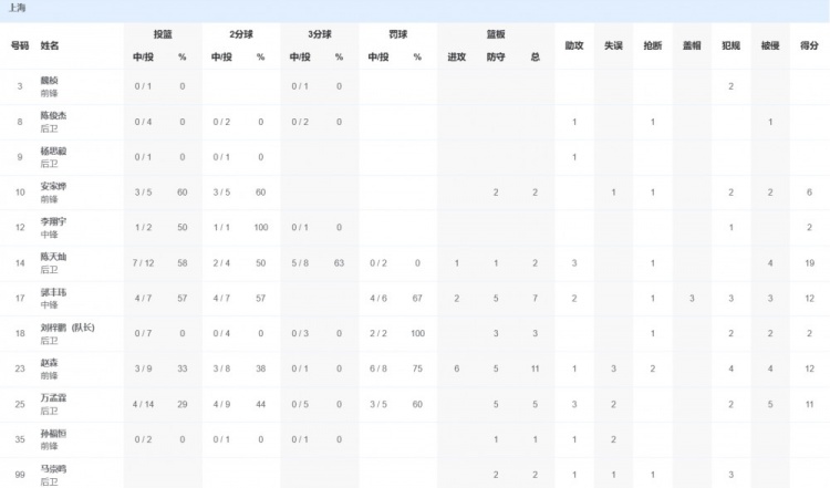 上海队方面,陈天灿19分2篮板3助攻,郭丰玮12分7篮板2助攻,赵森12分11篮板1助攻。