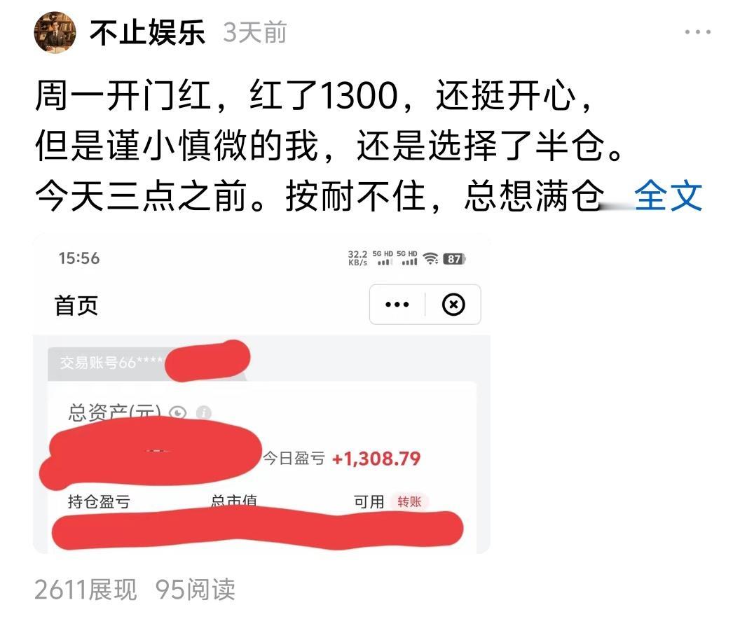 我周一选择半仓,是何等明智呀。 今天看到一则评论:人家那是日经, 大A是月经,一个月就红那么几天。 今天高开,跑了,下午两点半反转又追进去了,没想到一下子从红变绿。 幸亏追进去的不多。 前几天追抗R灭苗概念股的股友们还好吗?