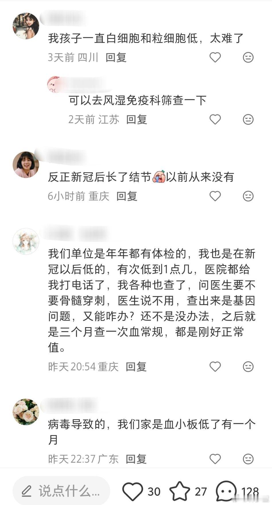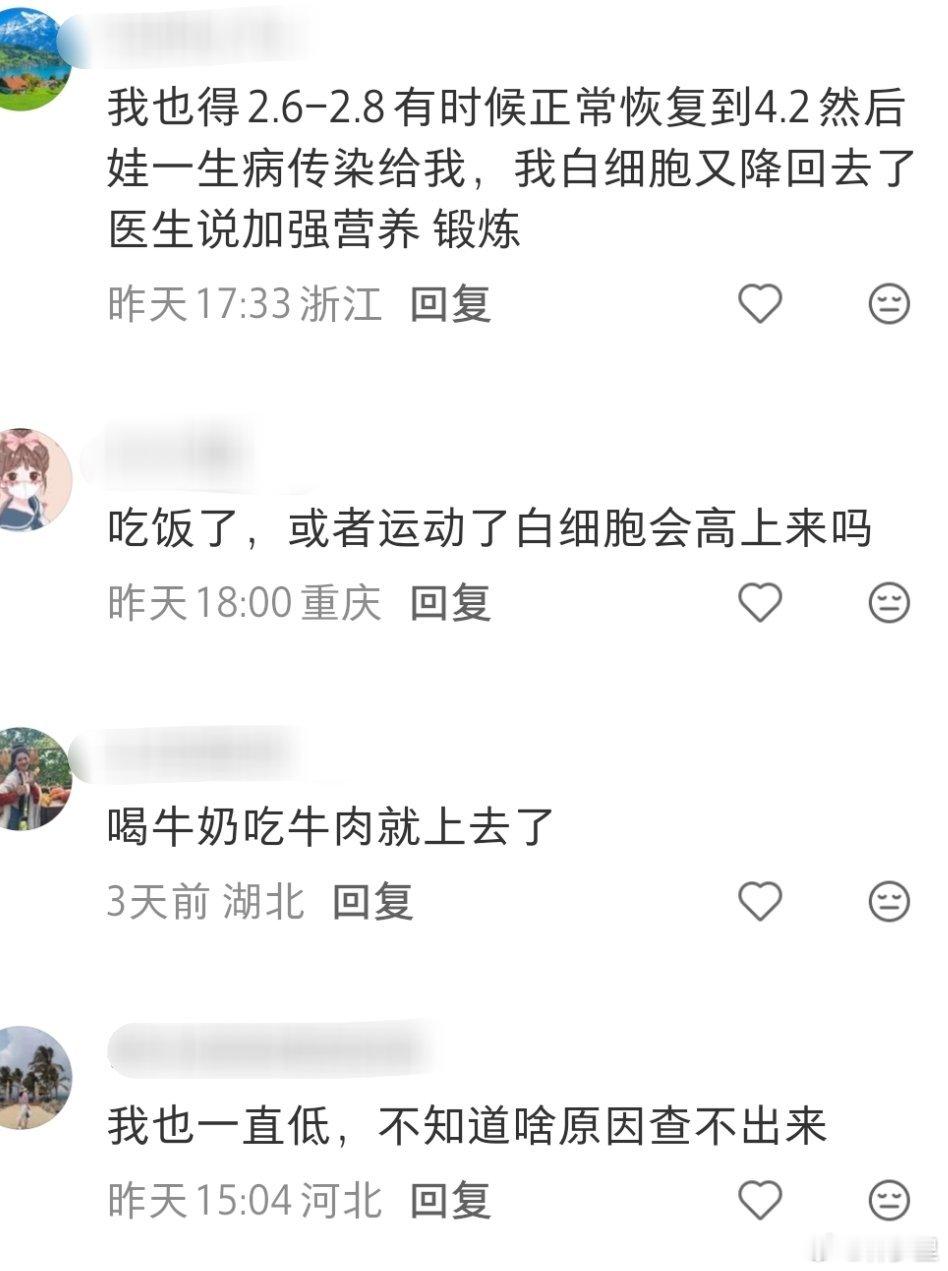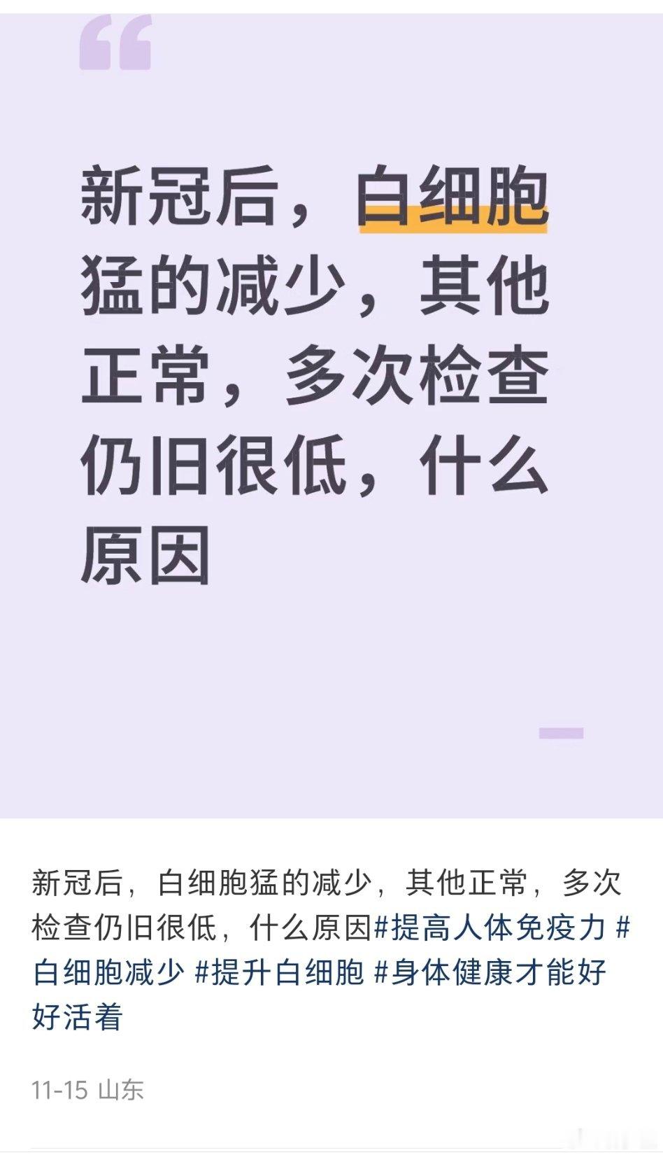 “新冠后,白细胞猛的减少”“多次检查仍旧很低”评论区一大堆“我也是”。白细胞主要是中性粒细胞、淋巴细胞、单核细胞、嗜酸性粒细胞 和嗜碱性粒细胞。所以,白细胞的作用就是免疫功能,抵御病原体入侵,清除体内异常细胞之类的。白细胞减少,意味着削弱免疫防御,增加感染风险,并可能提示潜在疾病。对细菌、病毒和真菌的抵抗力下降,容易发生口腔溃疡、反复呼吸道感染……等。