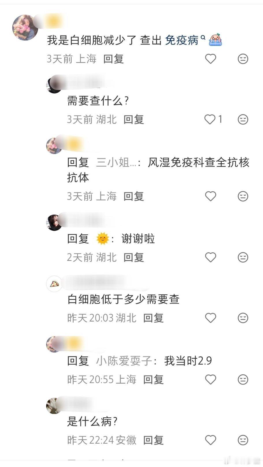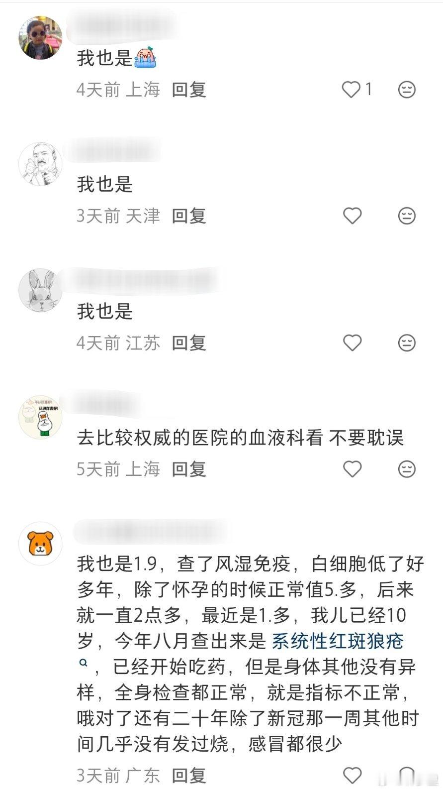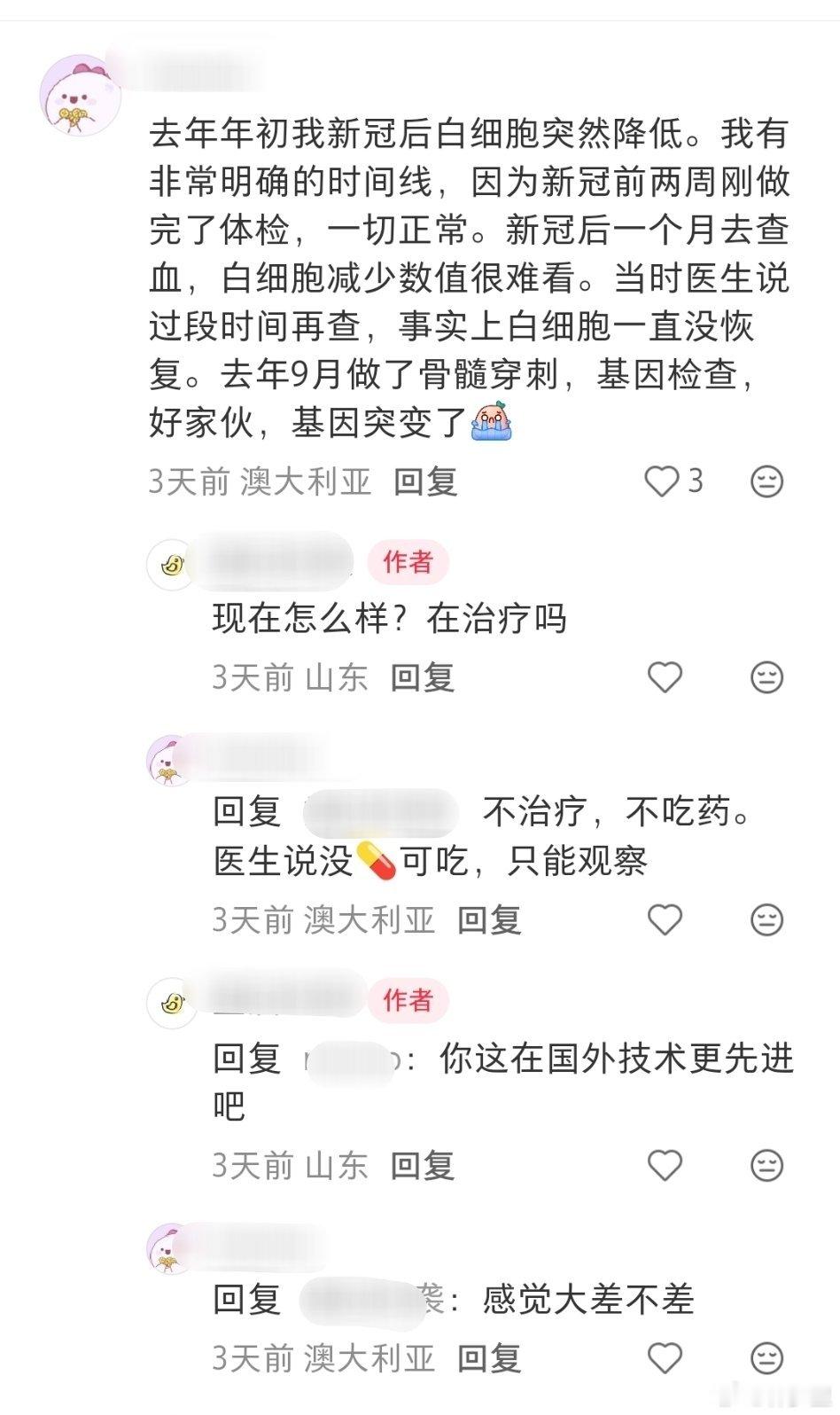 “新冠后,白细胞猛的减少”“多次检查仍旧很低”评论区一大堆“我也是”。白细胞主要是中性粒细胞、淋巴细胞、单核细胞、嗜酸性粒细胞 和嗜碱性粒细胞。所以,白细胞的作用就是免疫功能,抵御病原体入侵,清除体内异常细胞之类的。白细胞减少,意味着削弱免疫防御,增加感染风险,并可能提示潜在疾病。对细菌、病毒和真菌的抵抗力下降,容易发生口腔溃疡、反复呼吸道感染……等。
