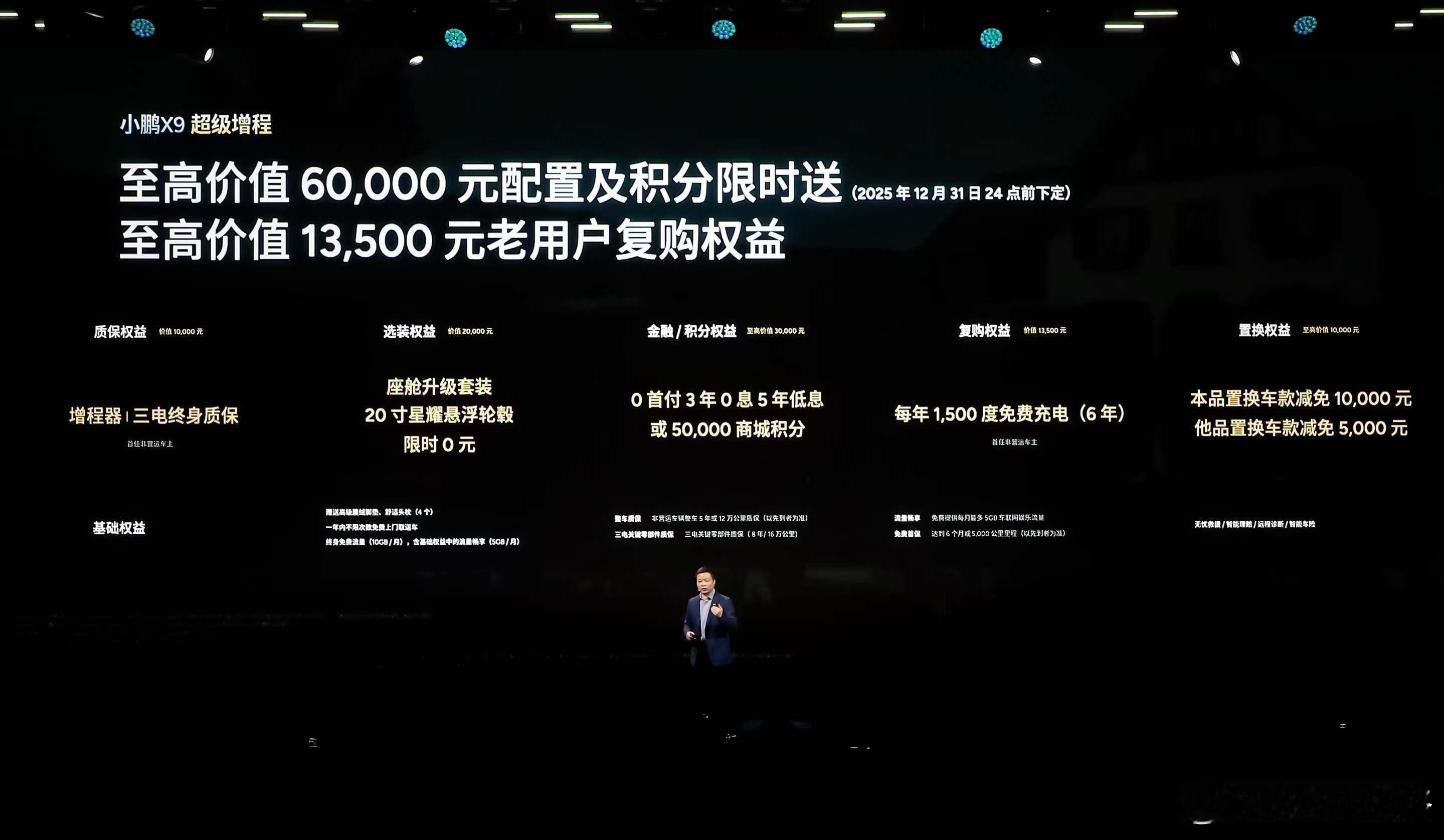 小鹏X9超级增程,30.98万起,既意料当中,又惊喜之上!有1602公里的全球最长续航,彻底打破里程焦虑,452公里的纯电续航,轻松应对城市通勤;更有非常全面的安全配置,极致的静谧性和舒适性,宽阔的百变空间。无论是日常通勤、接送家人,还是长途旅行,它都能轻松胜任。这定价,好卖,这结论完全可以下的