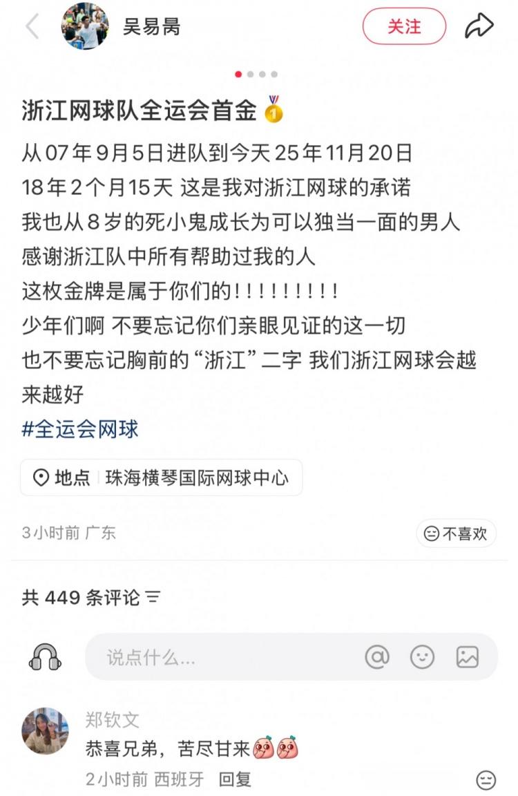郑钦文也在这条社媒下留言,祝贺吴易昺夺冠,她评论道:“恭喜兄弟,苦尽甘来。”定位显示郑钦文在西班牙,她目前正在从伤病中恢复,由于伤病没有完全恢复,郑钦文退出了本届全运会。