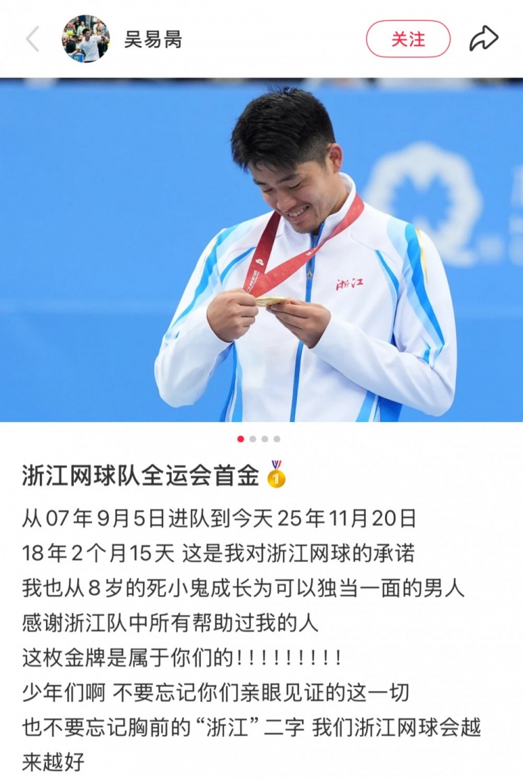从07年9月5日进队到今天25年11月20日,18年2个月15天这是我对浙江网球的承诺,我也从8岁的死小鬼成长为可以独当一面的男人,感谢浙江队中所有帮助过我的人,这枚金牌是属于你们的!