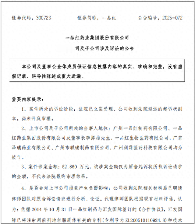 近期,一品红(300723.SZ)发布公告称,该公司及其多家子公司因知识产权纠纷被汇友国际有限公司(以下简称“汇友国际”)起诉,涉案金额高达5.28亿元。