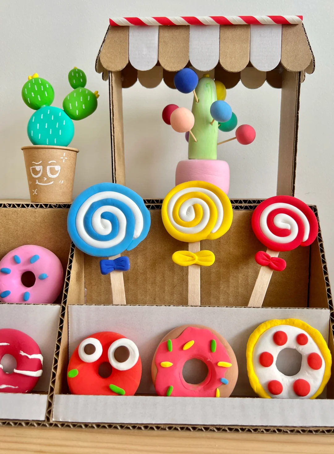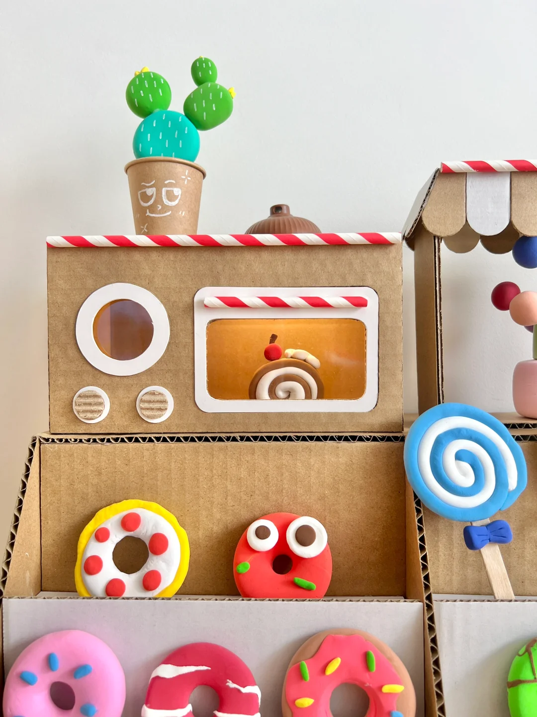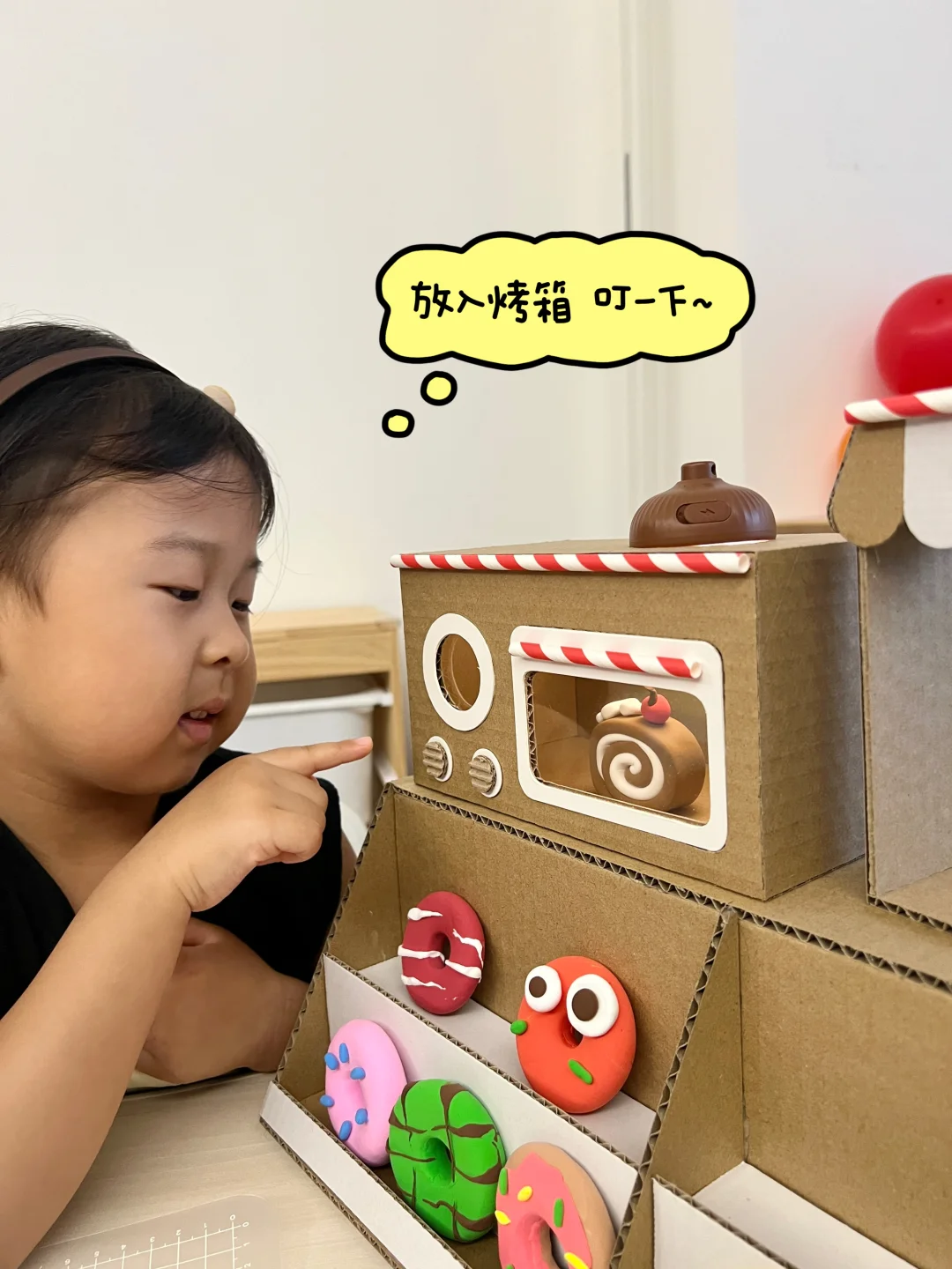 今天教大家用废纸箱和粘土做个甜品小铺,让娃实现甜品自由啦[派对R][派对R]