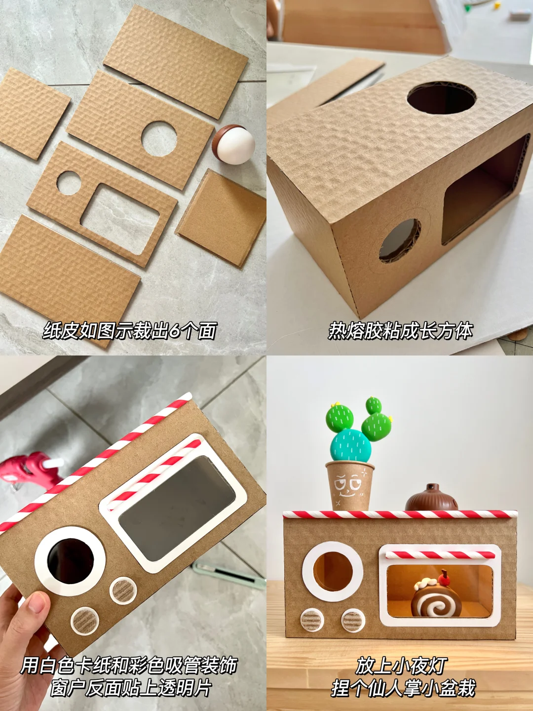 ✂️用到的材料:快递纸箱、美乐童年胶囊粘土、美工刀、热熔胶、雪糕棍、吸管、透明片、小夜灯、竹签……