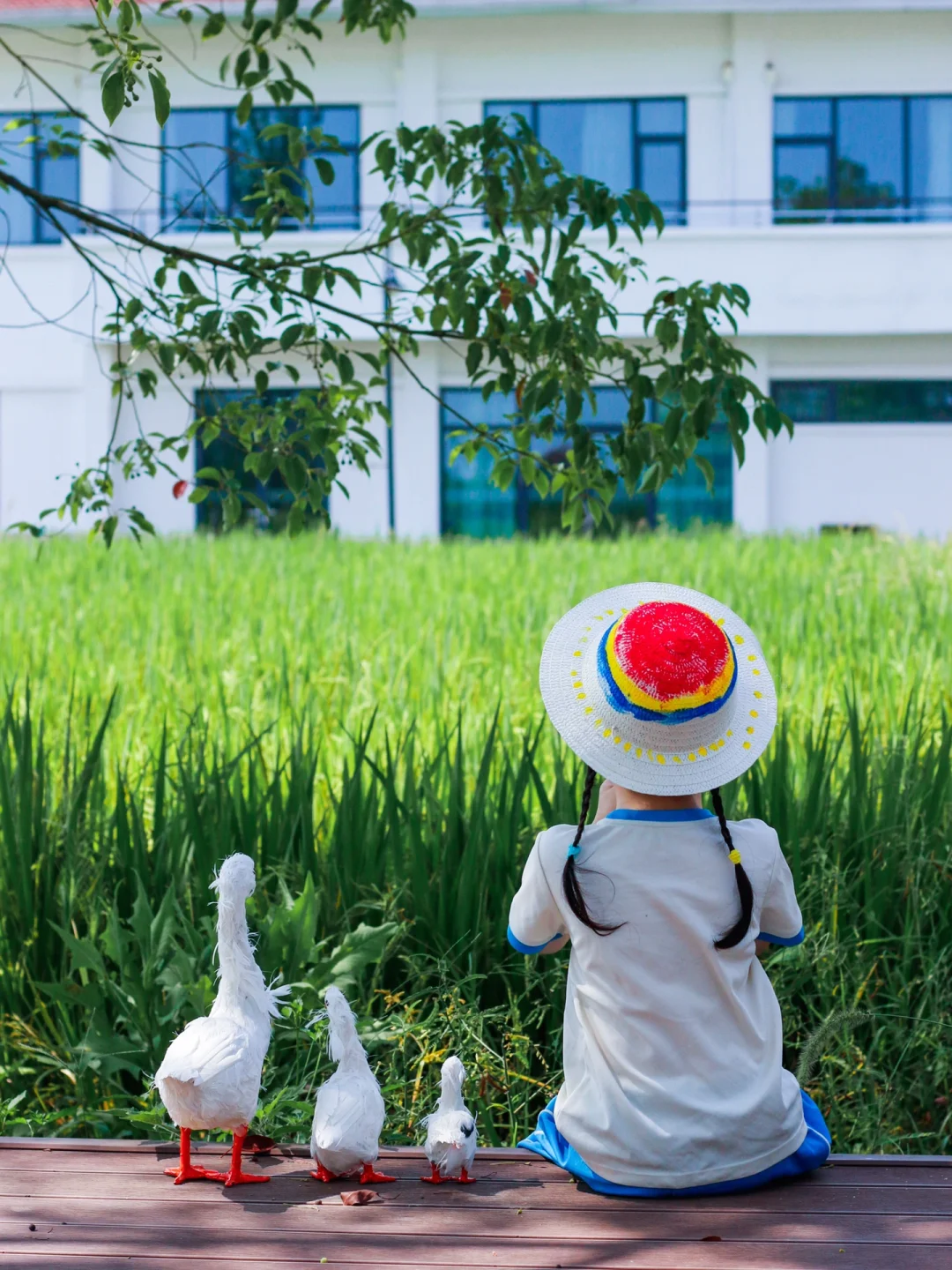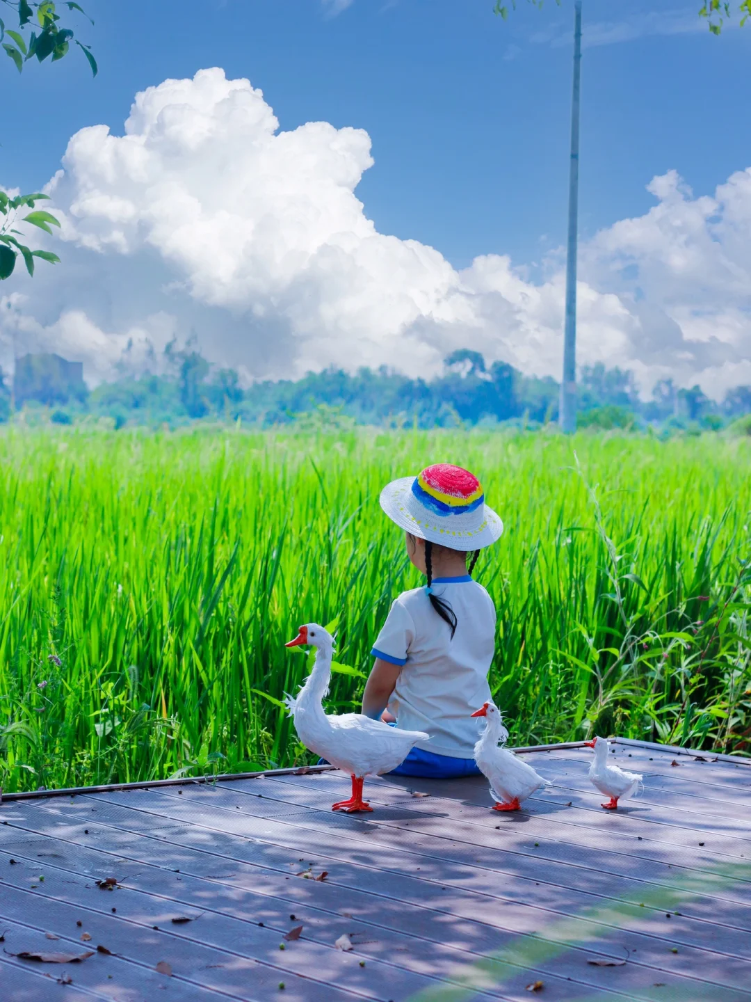 --在蓝天白云下💦,治愈的稻田河岸边,围绕一群小鸭子,复刻一波漫画中场景~