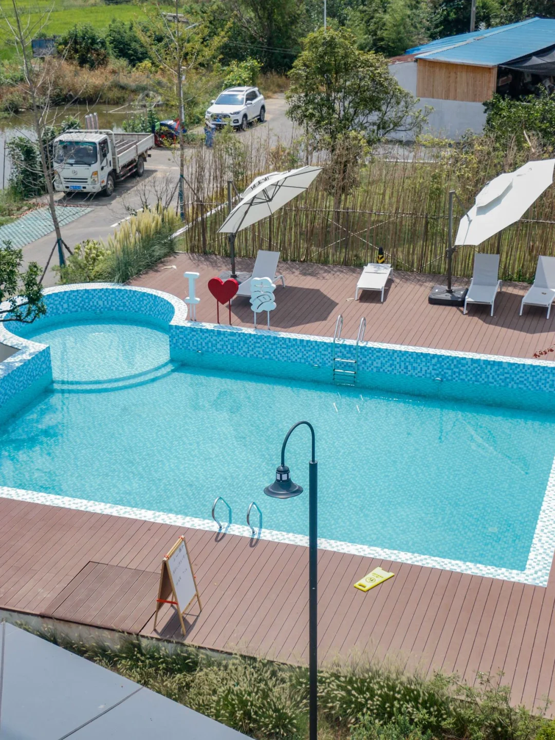 夜晚,我们去了民宿的户外泳池,泡在泳池里很凉爽,灯光洒下来挺浪漫的.