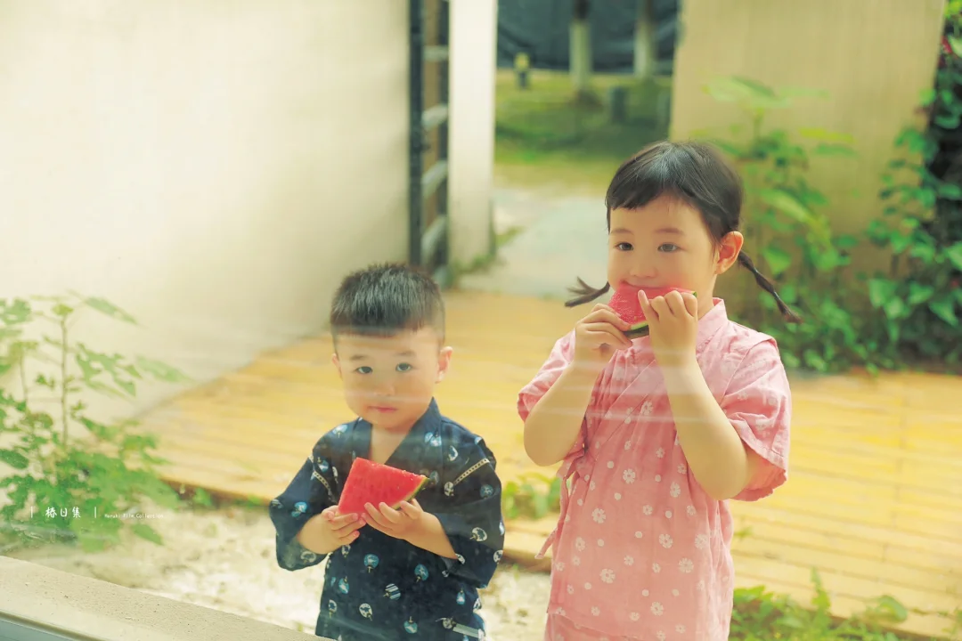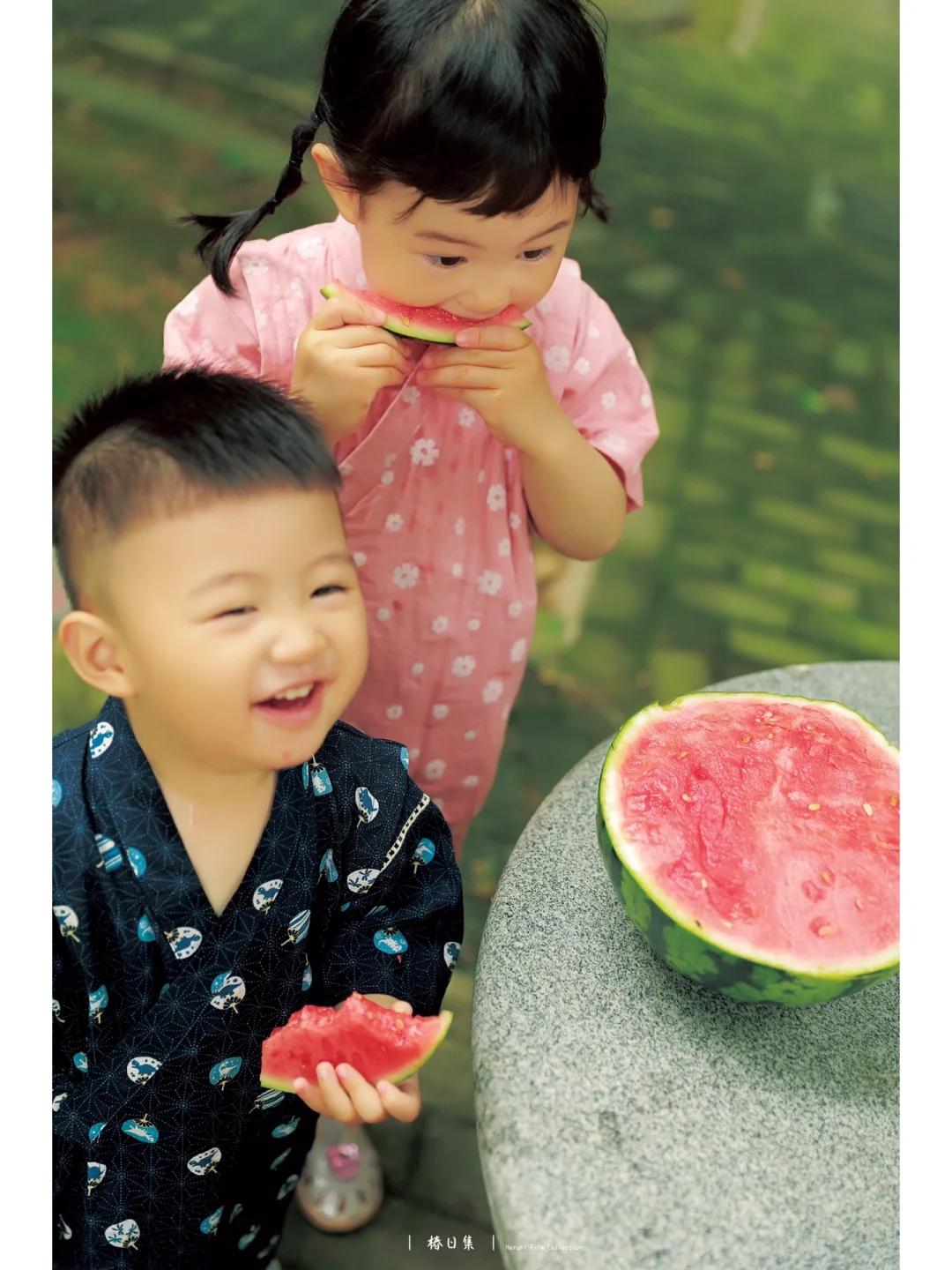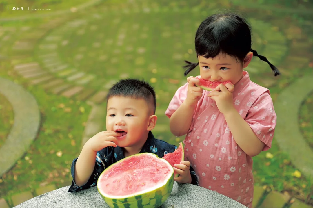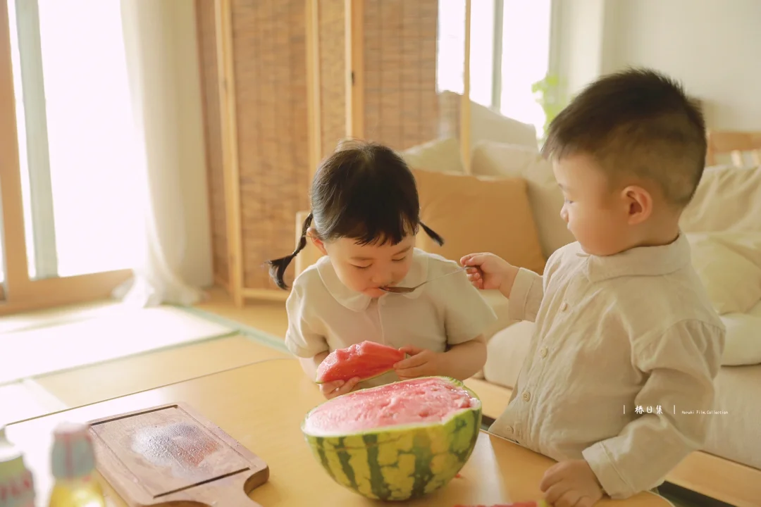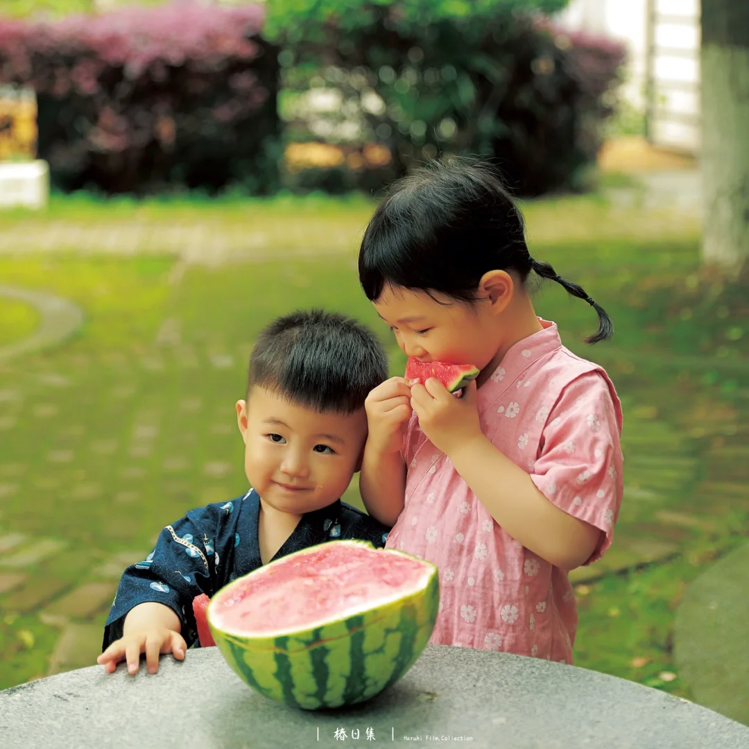 姐弟俩在炎炎夏日 一起吃着清凉的西瓜