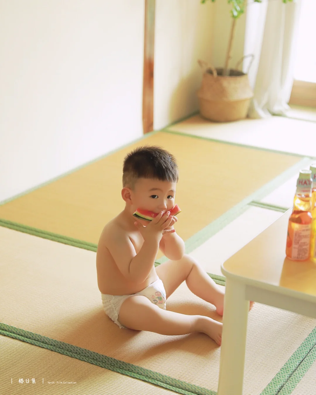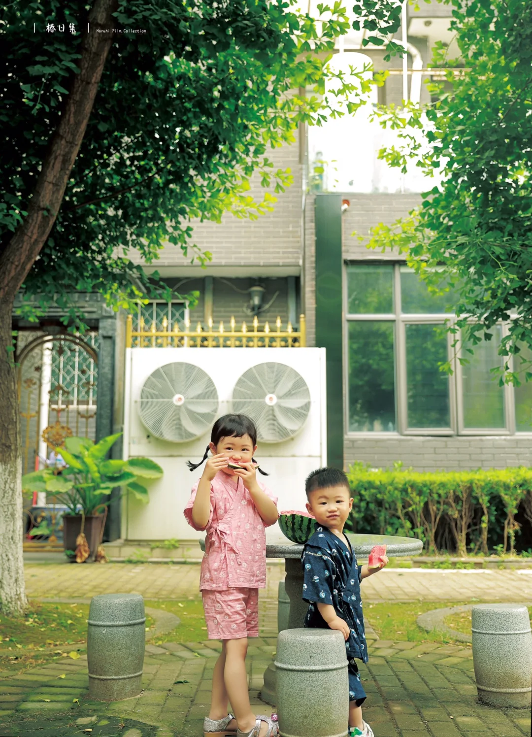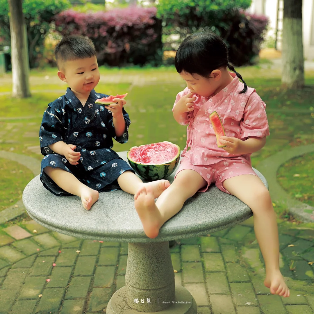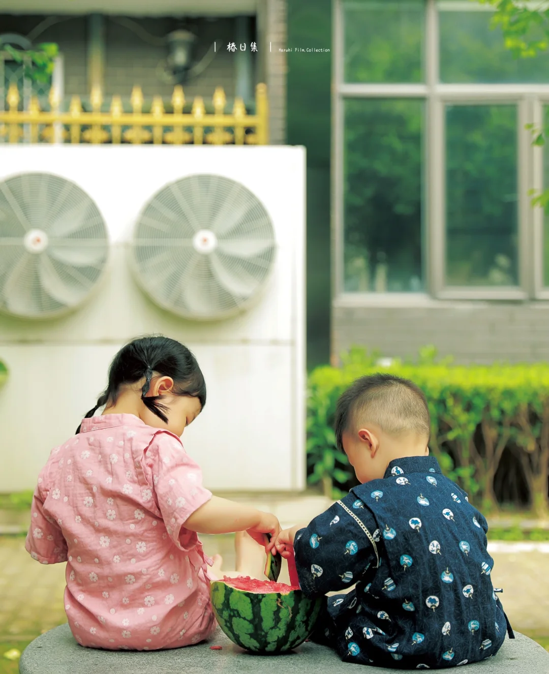 姐弟俩在炎炎夏日 一起吃着清凉的西瓜