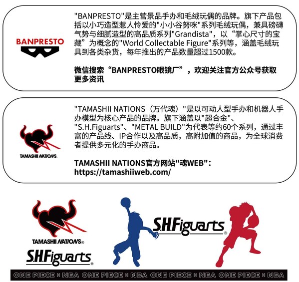 本次联名企划旨在融合动画与体育这两种不同文化来提升双方的品牌价值。万代南梦宫(上海)娱乐有限公司希望能够把此次联名活动所催生的协同效应注入到各类商品中,让《航海王》所描绘的为梦想而战、同伴彼此之间的友谊、精心构筑的世界观,与NBA所蕴含的富有活力的团队合作、坚定不移的热情、对胜利的执着相互交织,创造出前所未有的全新魅力。
