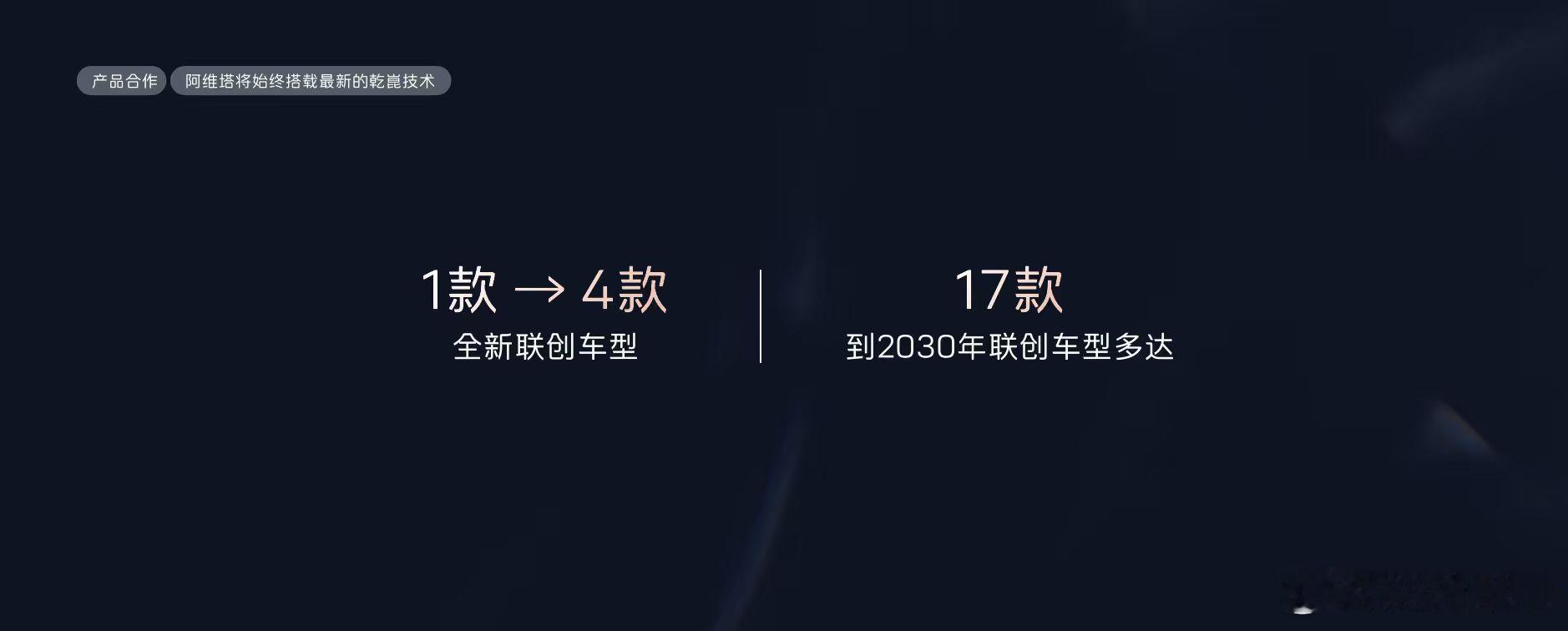 来看一下阿维塔和华为乾崑全面深化战略合作的细节。合作模式从之前的 HI 模式升级为 HI PLUS 模式,合作范围扩展到:- 用户洞察- 产品定义- 产品开发- 整合营销等技术层面昨天华为乾崑发的 ADS 高速 L3 解决方案、MoLA 加持下的鸿蒙座舱 L3 都会上阿维塔车型。2026年,阿维塔和华为的全面联创车型会一款增加到四款,到 2030 年,双方将联合共创 17 款车型。