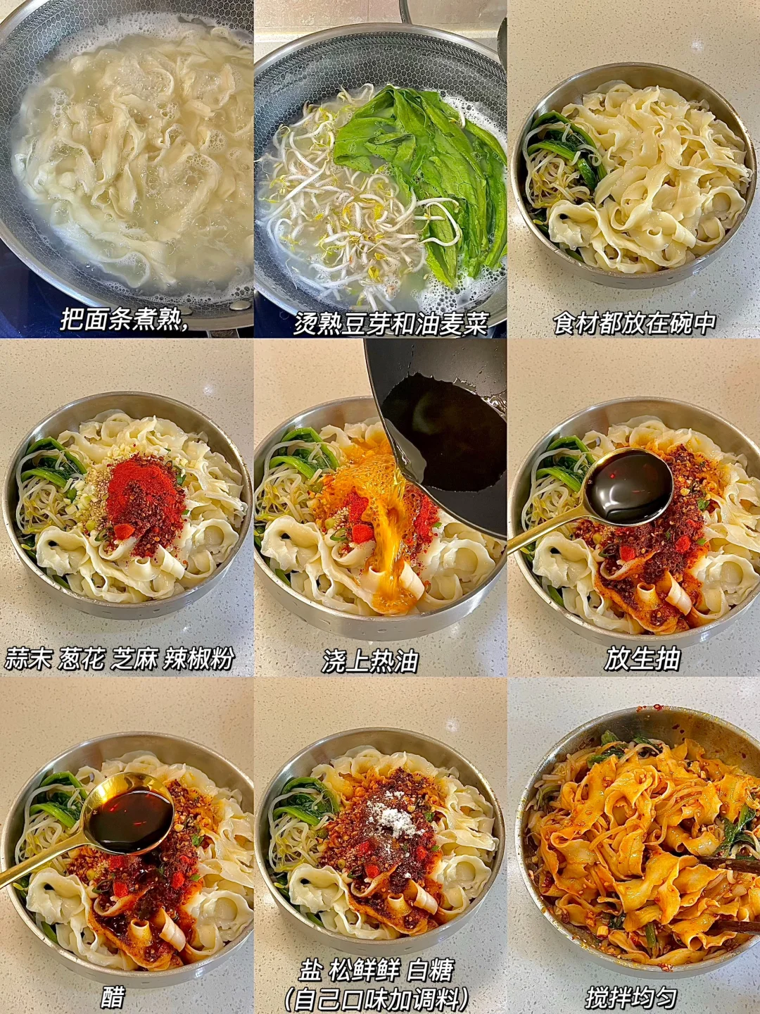 我家的春天真好吃 做菜我是认真的 今日份一人食午餐分享: 油泼面 大麦茶🍵 . 食材:粗湿面条 油麦菜 豆芽 做法如图上⬆️ . 很多宝宝让我发面条的不同吃法 这不就来了~ 贼好吃的油泼面,一吃一个不吱声