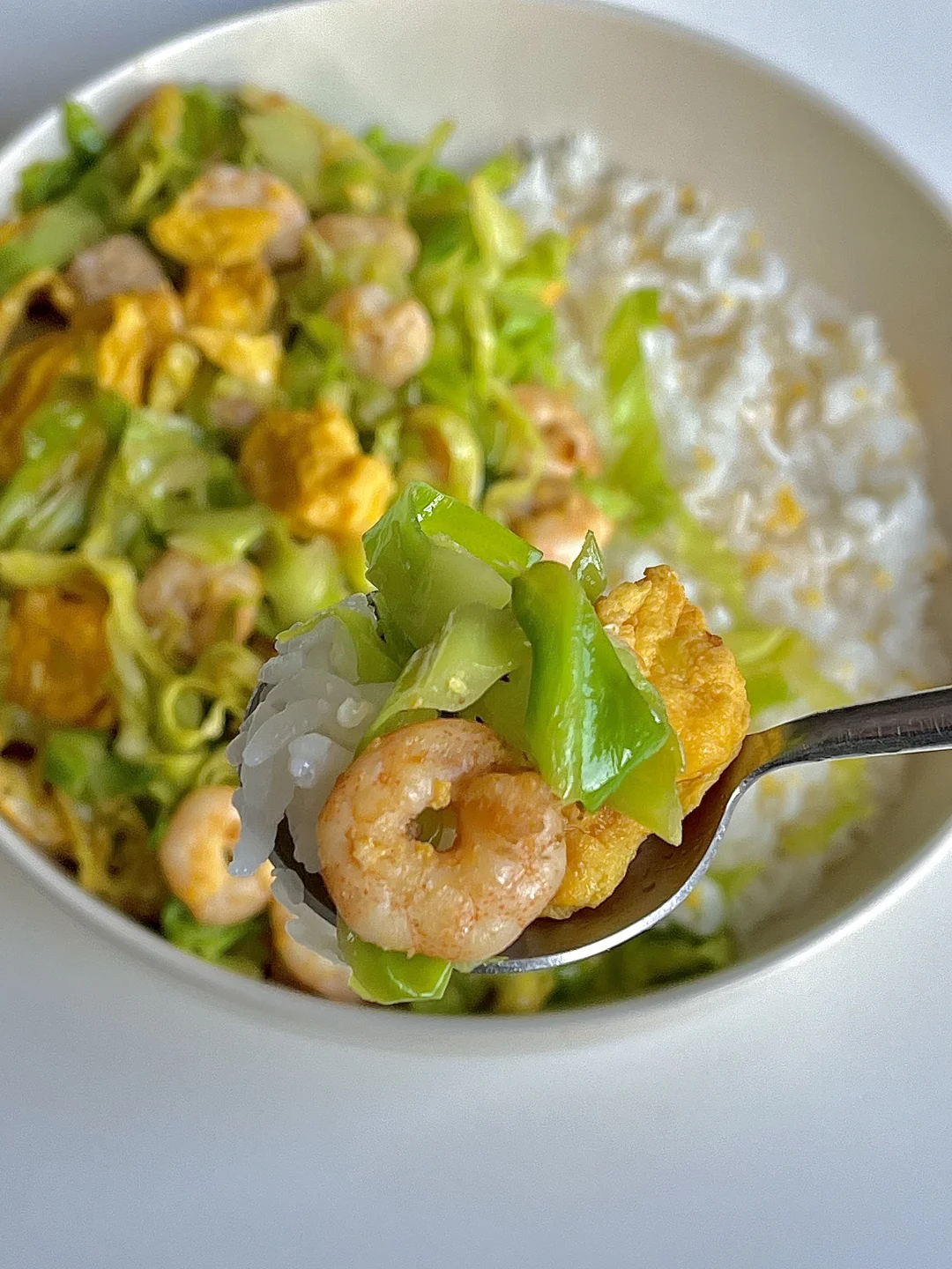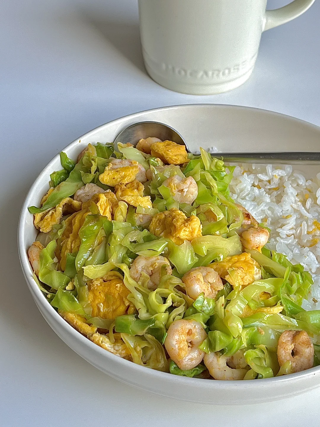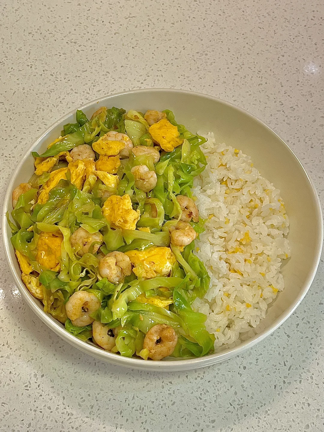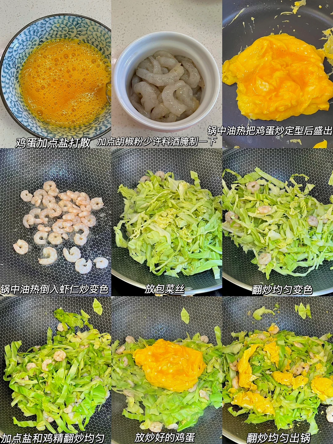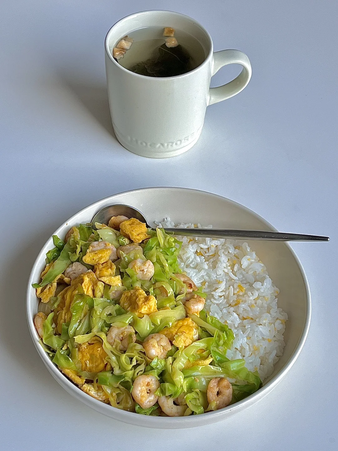 做菜我是认真的 粗茶淡饭最养人 今日份一人食健康餐分享: 包菜炒虾仁鸡蛋 玉米碴米饭🍚 一杯茉莉果茶 . 食材:半个包菜 两个鸡蛋 100克虾仁 做法如图上⬆️ . 清爽好吃又健康的一道菜,你们都去试试,巨好吃😋