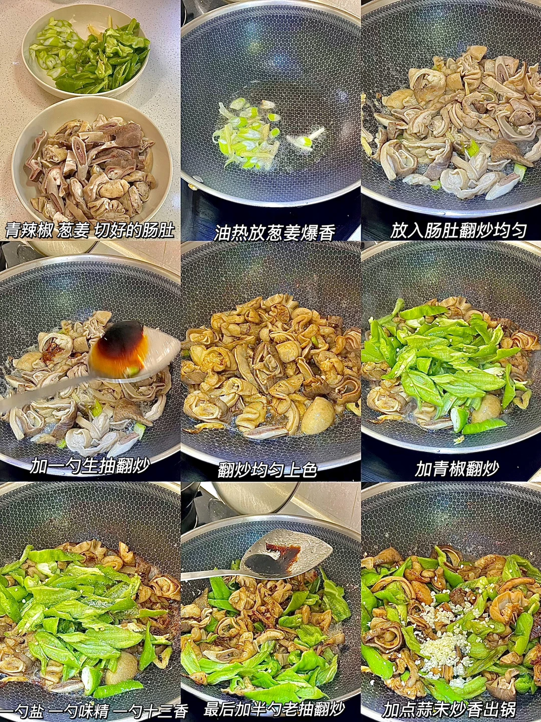 2️⃣锅中油热放葱姜爆香,加入肠肚翻炒均匀。