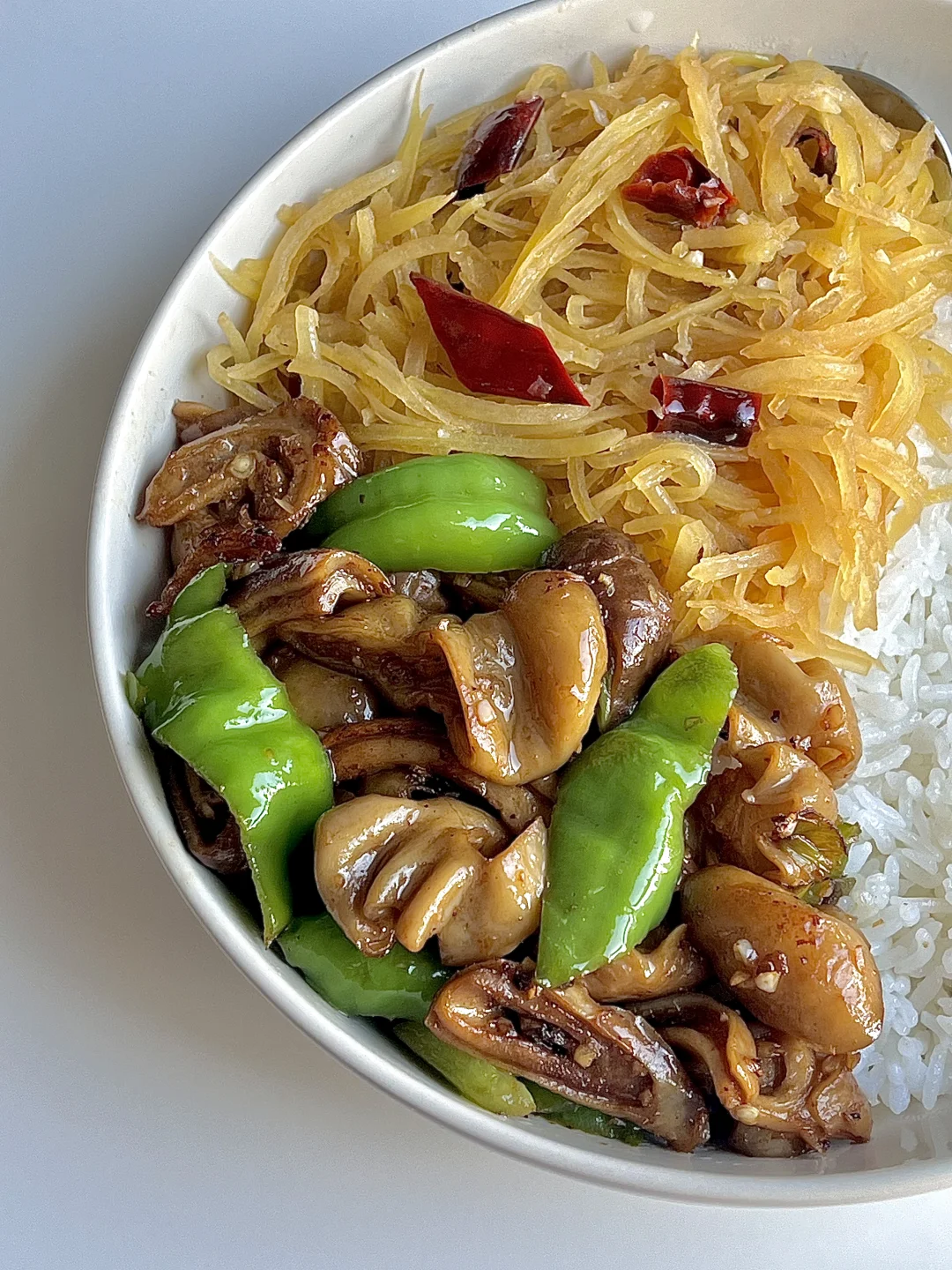 3️⃣加一勺生抽翻炒上色,加辣椒炒香。