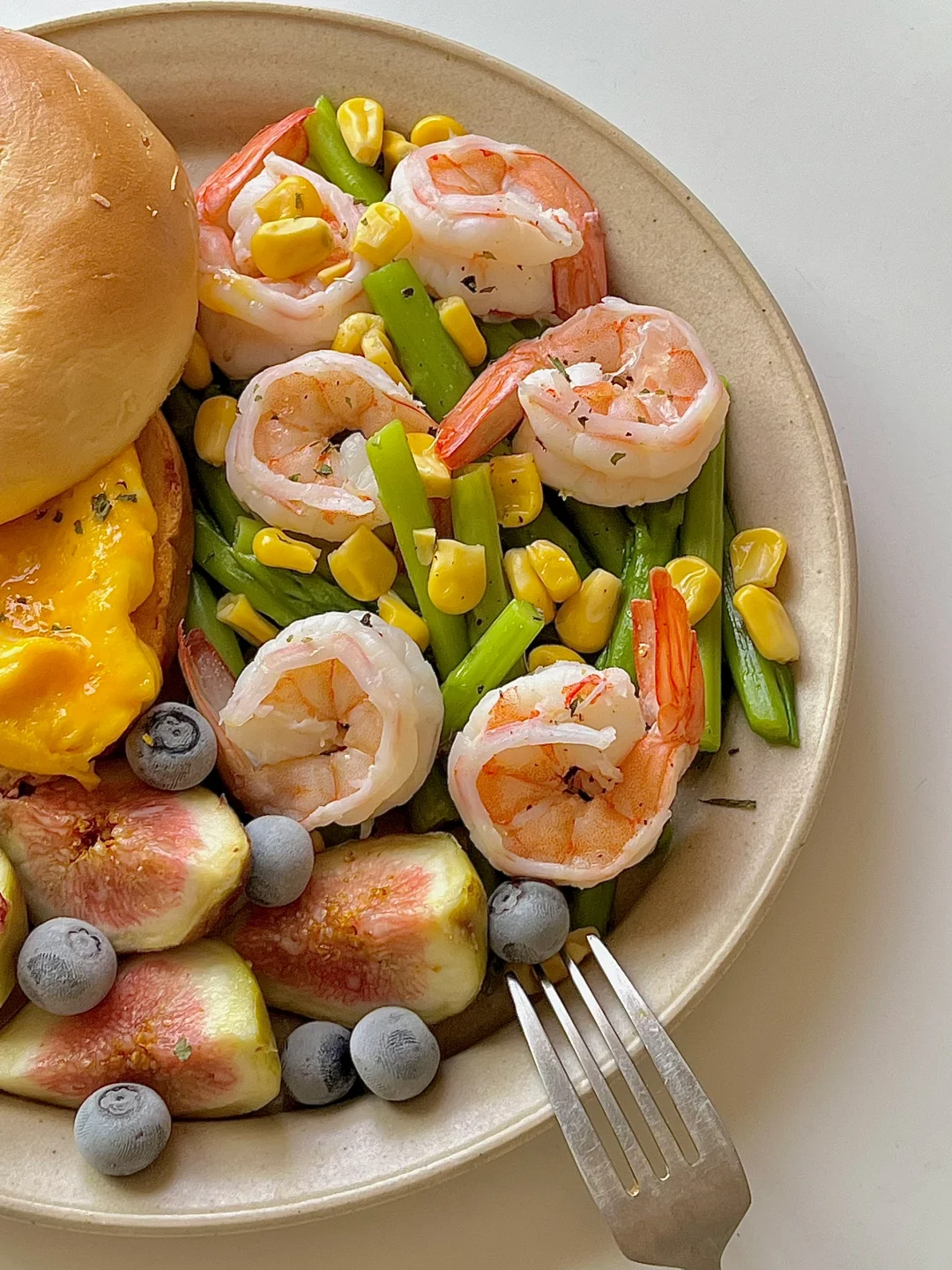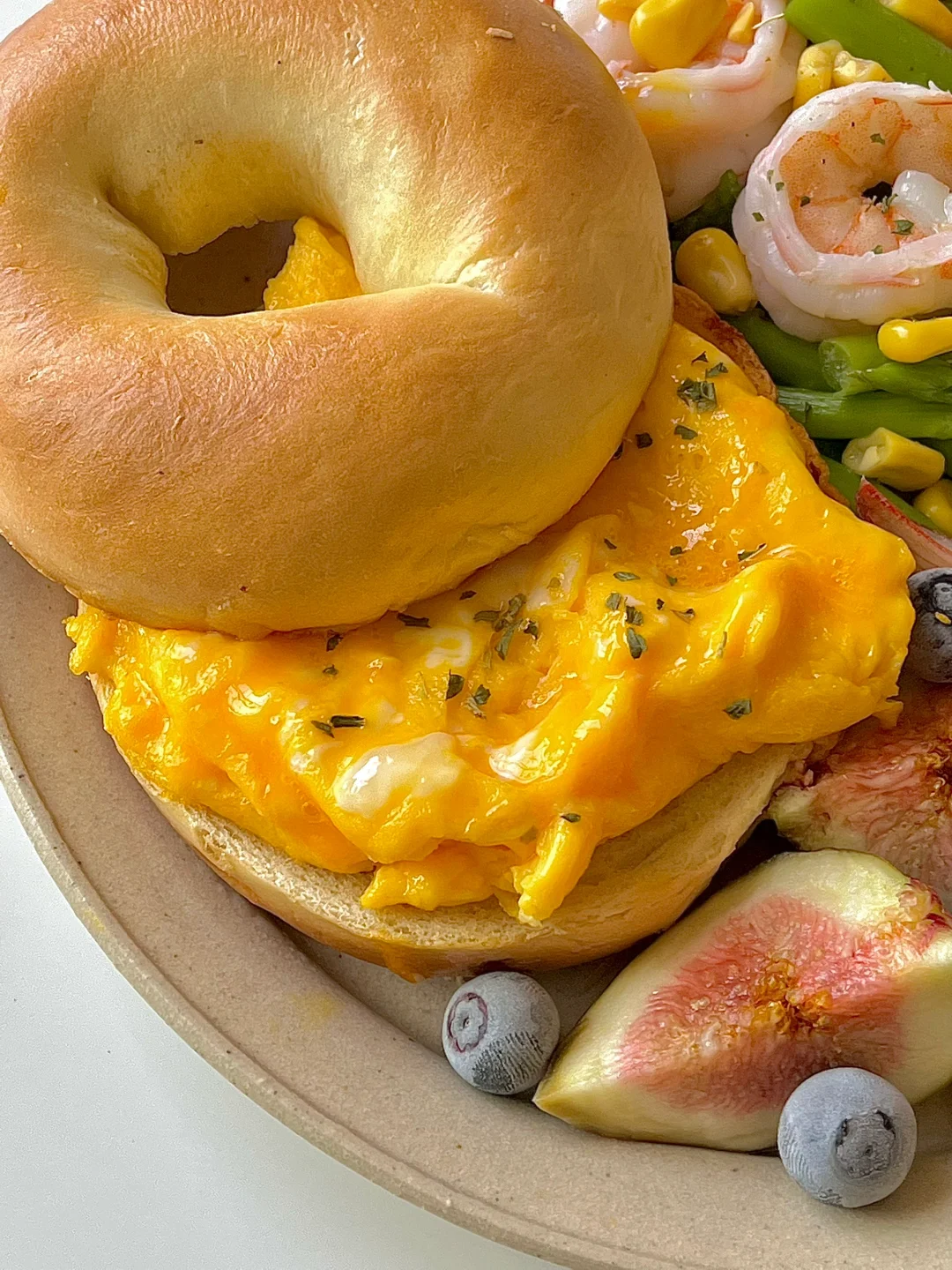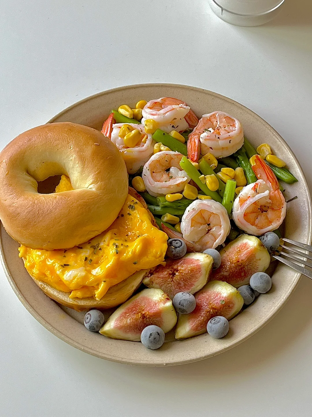 ☀️工作日早餐|贝果滑蛋🥯芦笋虾仁玉米沙拉
