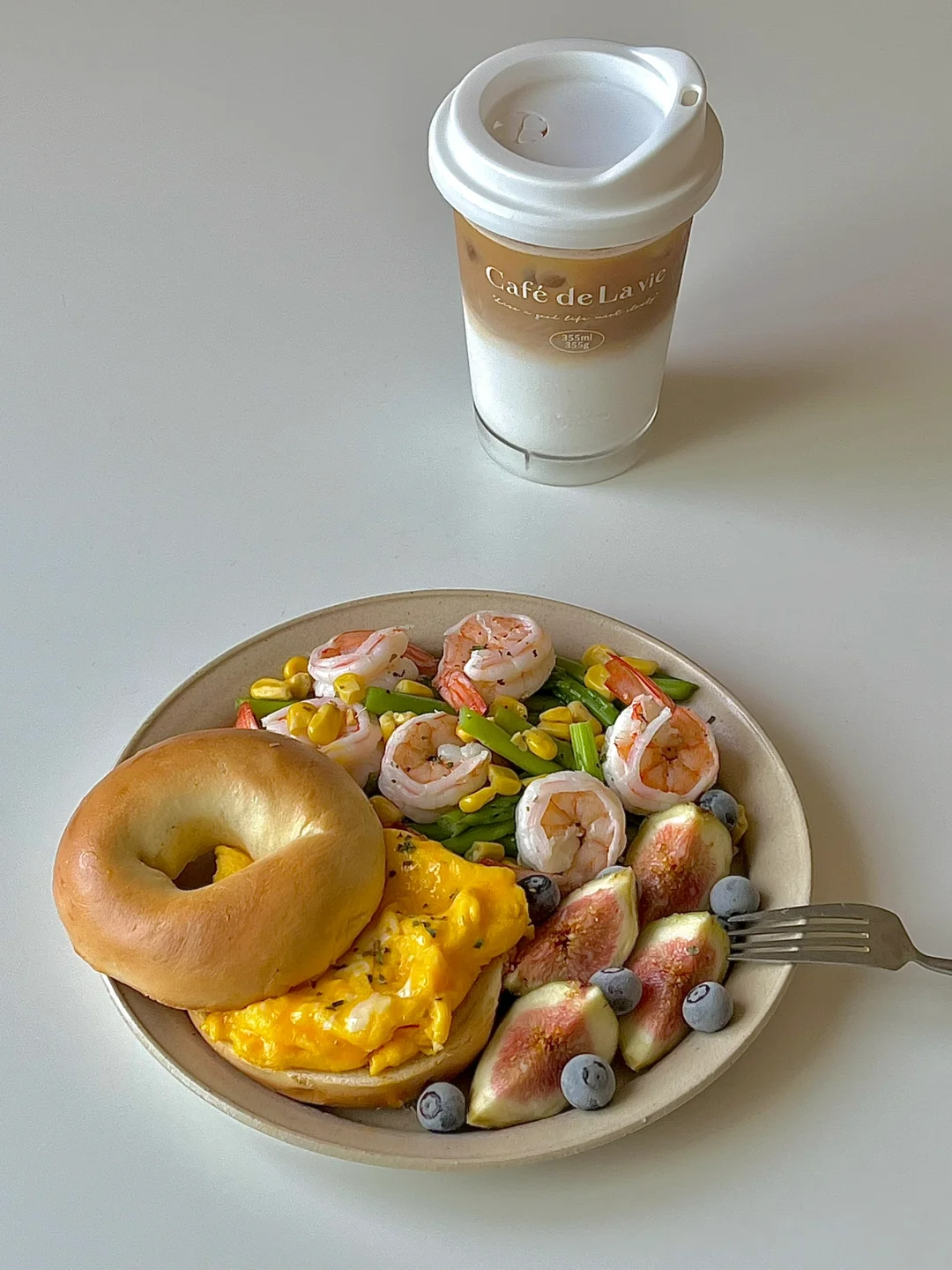 今日份早餐分享: 滑蛋贝果三明治🥯 虾仁芦笋玉米沙拉🥗 无花果 蓝莓🫐 一杯冰拿铁☕️ . 喜欢早餐盘满满当当的 喜欢吃什么就放一点,这样就很满足😋