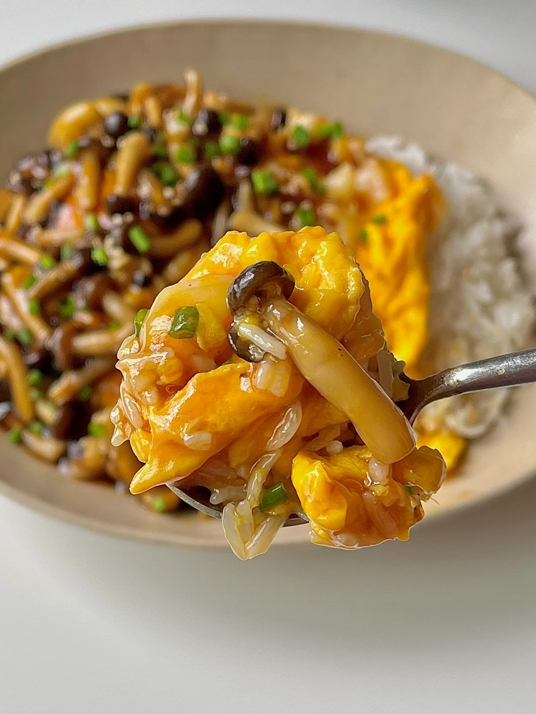 4️⃣米饭上放上滑蛋虾仁再放上蘑菇丁,撒点葱花,