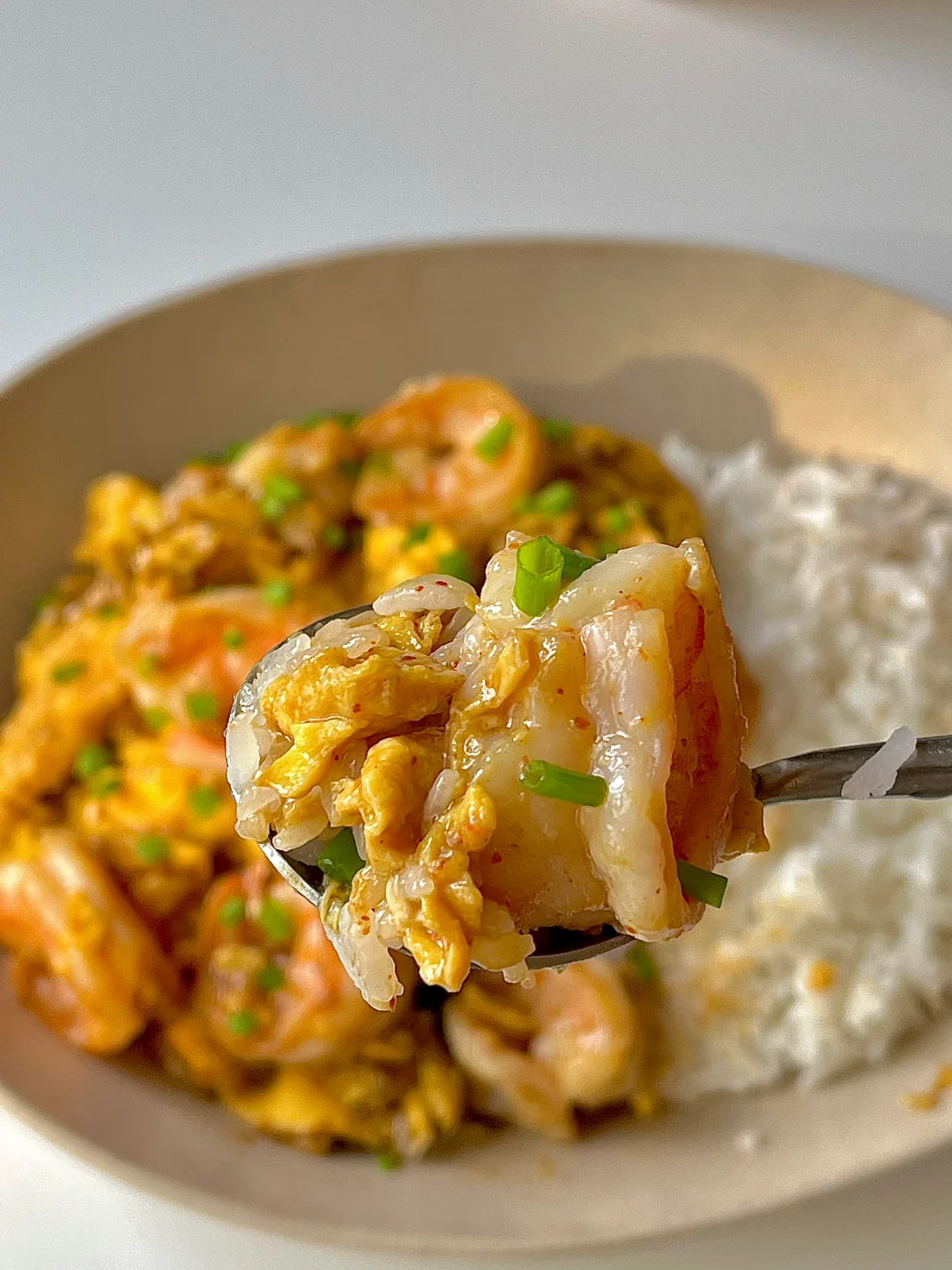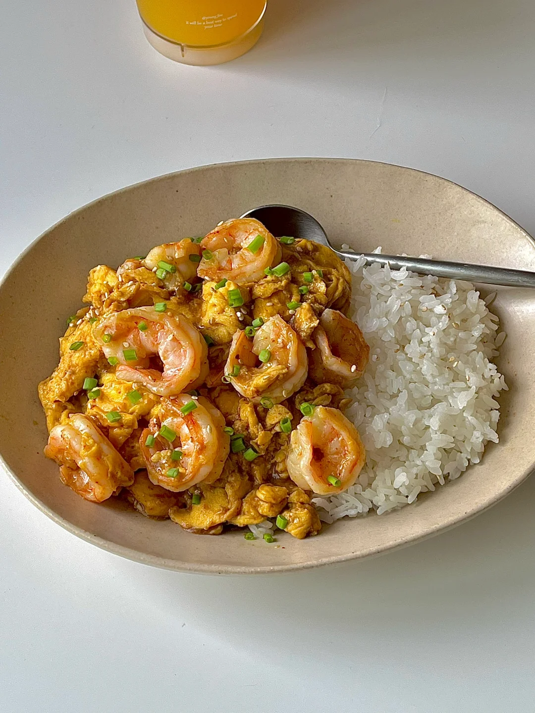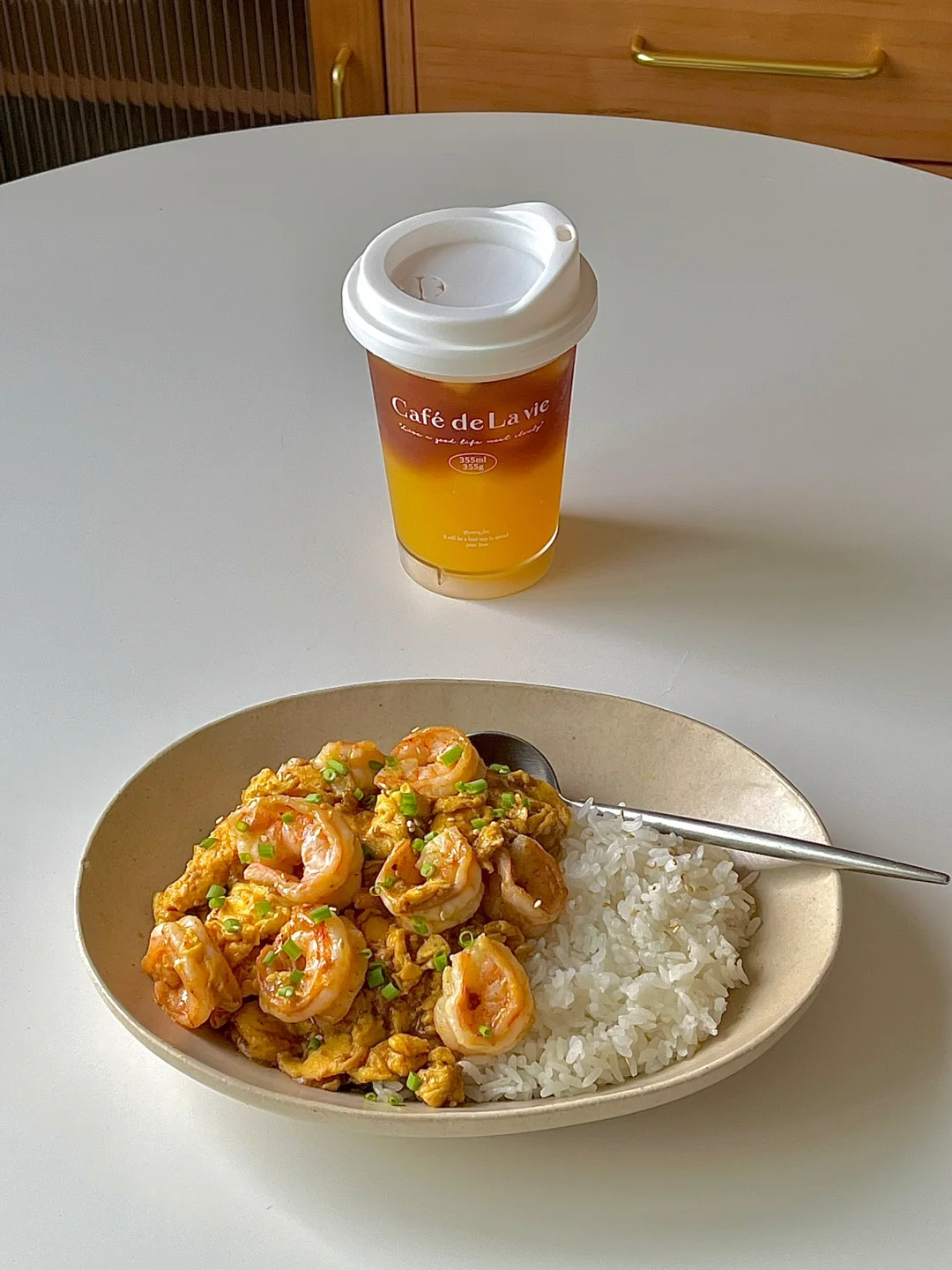 今日份早午餐分享: 滑蛋虾仁盖饭 一杯橙C美式☕️ . 1️⃣调个好吃的酱汁(两勺生抽 一勺蚝油 一勺淀粉 一勺辣椒粉 半勺糖 一小勺盐 半碗清水)搅拌均匀。 2️⃣三个鸡蛋加少许水搅拌均匀。 3️⃣锅中油热放入虾仁煎熟后盛出备用。 4️⃣锅中再放少许油,把蛋液倒入锅中,蛋液往中间推,做成嫩嫩的滑蛋。 5️⃣再放入煎熟的虾仁,倒入酱汁。炒至浓稠即可。 . 今天的盖饭真是高蛋白又贼好吃的😋 这个酱汁你们一定要试试,可以多放点,有点汤汁泡饭更好吃😋