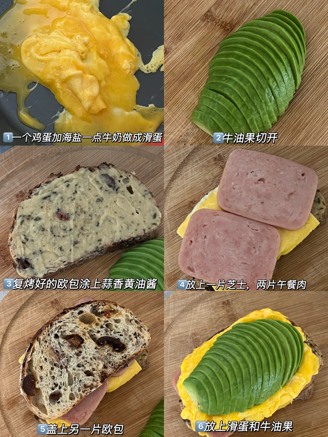 今日份早餐分享: 芝士滑蛋火腿牛油果三明治🥪 一杯冰美式☕️ . 1️⃣复烤两片欧包。 2️⃣一个鸡蛋加点牛奶放入锅中做成滑蛋。 3️⃣牛油果切片,把午餐肉煎一下。 4️⃣一片欧包上涂上蒜香黄油酱,放上一片芝士。 5️⃣再放煎好的午餐肉,盖上另一片欧包。 6️⃣放上滑蛋和牛油果🥑撒点海盐黑胡椒和芝麻。 . 咬一口就很满足的三明治谁能不爱😋