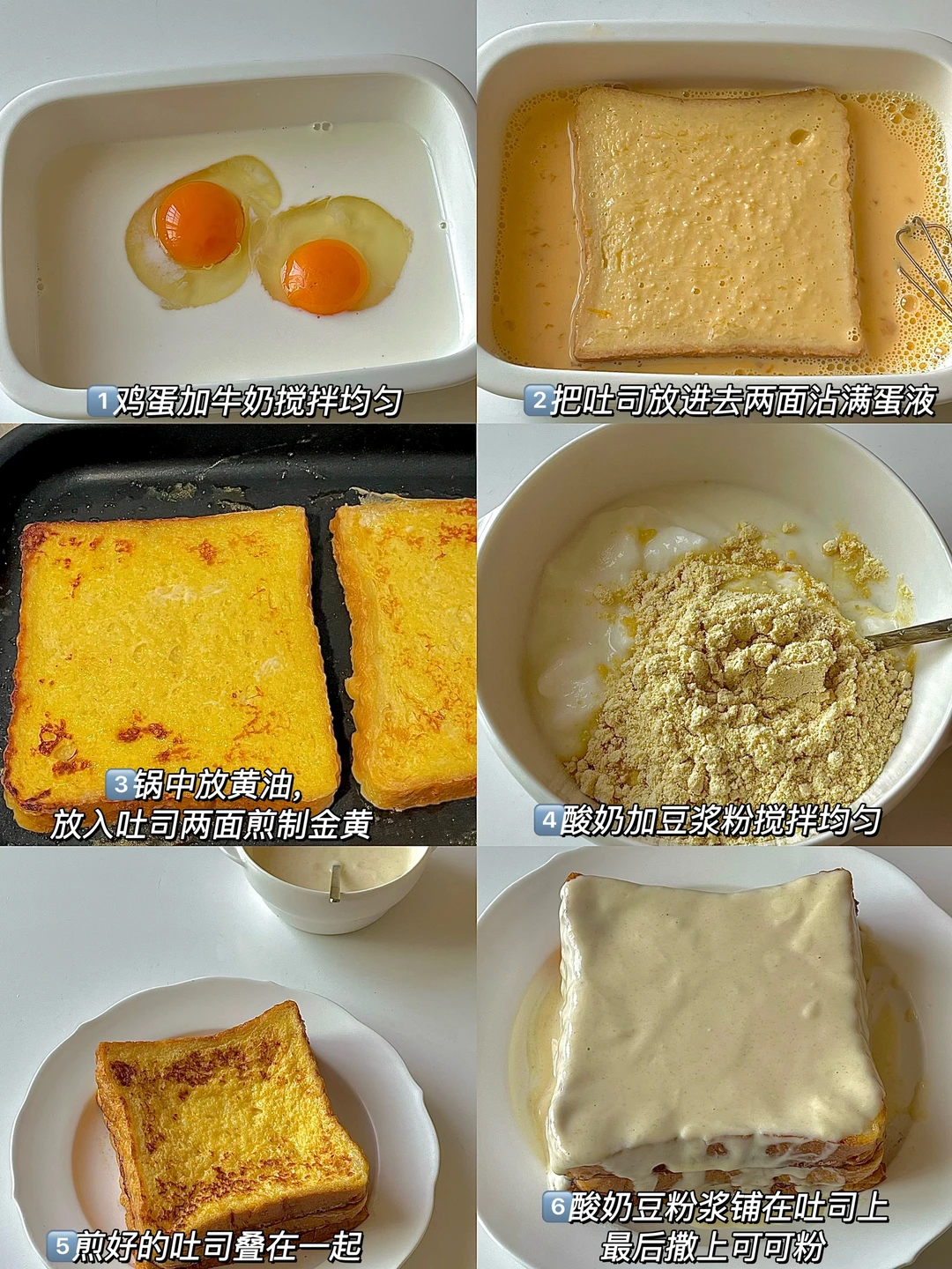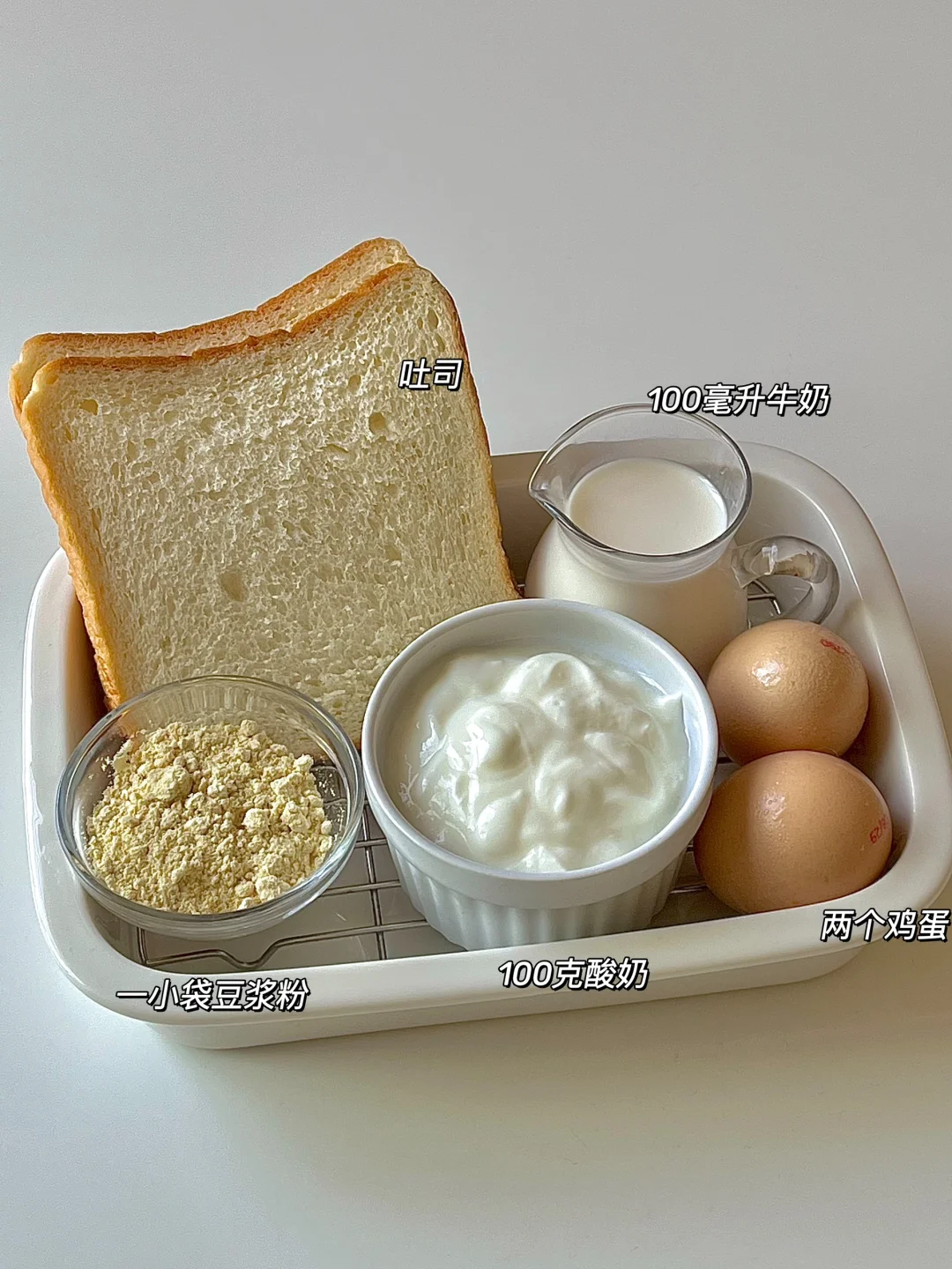 漏奶华食材:吐司两片|鸡蛋两个|牛奶100毫升|豆浆粉一包|可可粉适量|酸奶