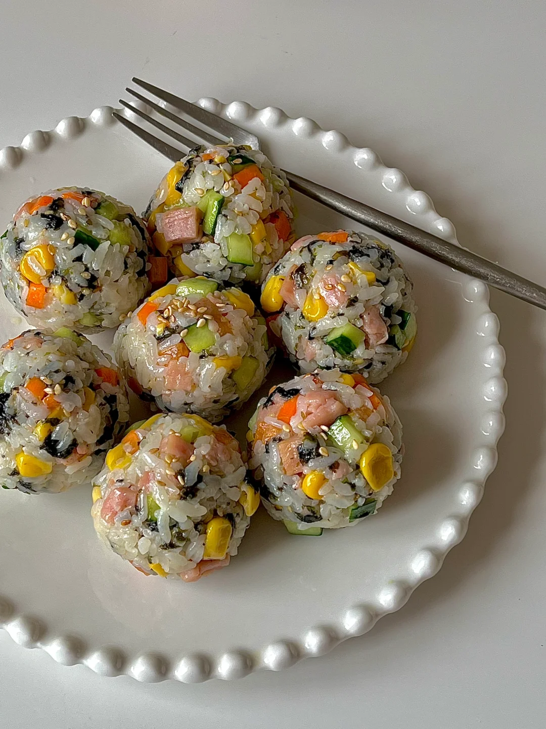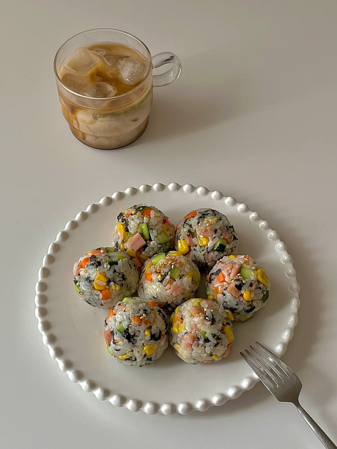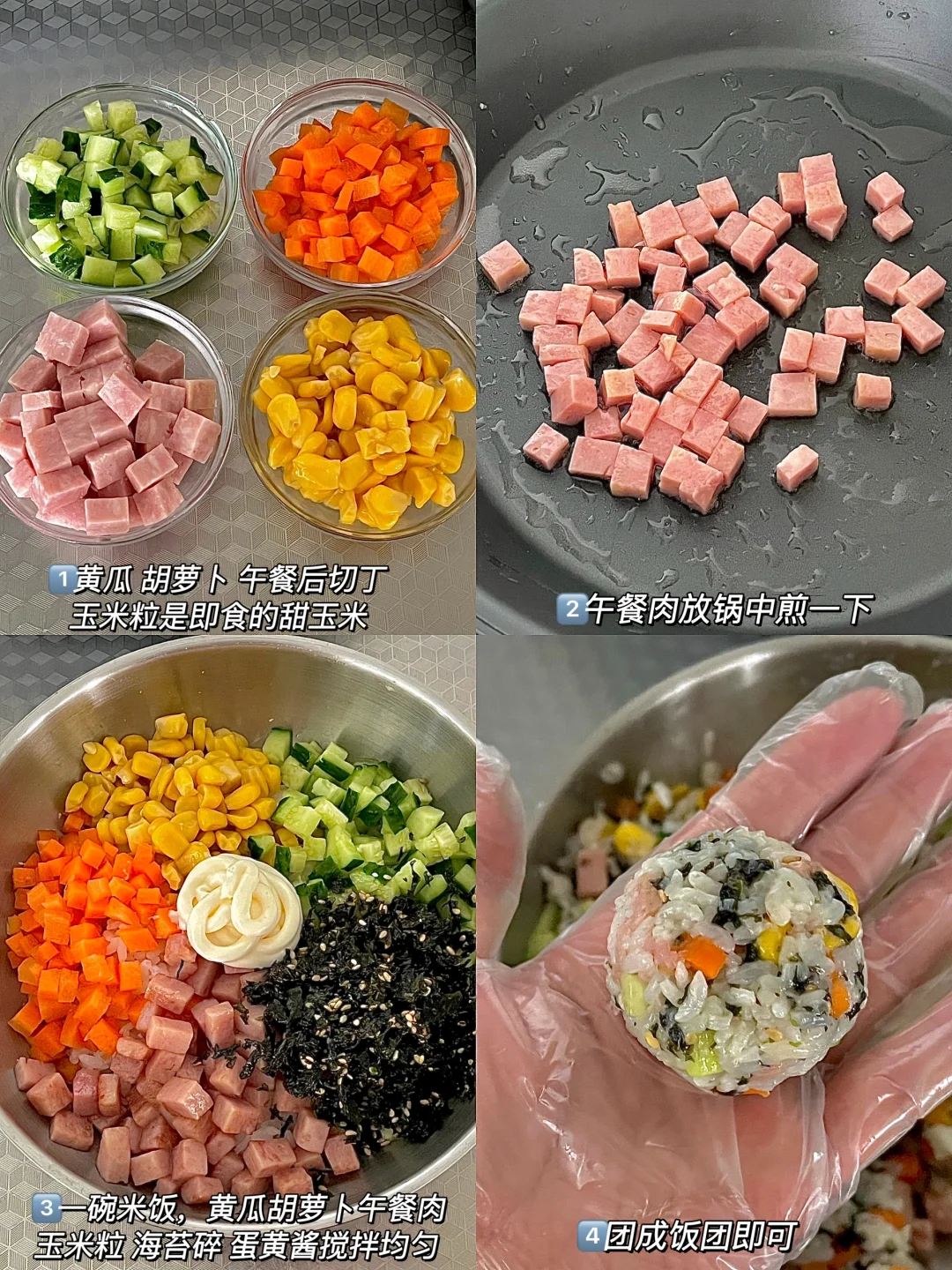 今日份早餐分享: 午餐肉杂蔬饭团🍙 一杯拿铁☕️ . 家里昨晚还剩下点米饭不能浪费了 做个简单快手又好吃的饭团子🍙 . 1️⃣黄瓜 胡萝卜 午餐肉都切成小丁。玉米粒是即食的 2️⃣午餐肉放在锅中煎一下。 3️⃣把黄瓜 胡萝卜 玉米 午餐肉 海苔碎 低卡蛋黄酱都放在米饭上,滴几滴香油更香。 4️⃣手上戴个手套,搓成饭团即可。 . 清清爽爽,味道好极了😋