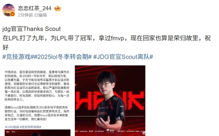 直播吧11月21日讯今日JDG官方宣布中单选手Scout离队,爆料人恋恋红茶表示:在LPL打了九年,为LPL带了冠军,拿过fmvp,现在回家也算是荣归故里,祝好