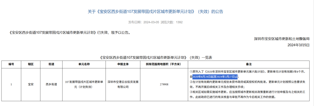 该项目原列入了《2020年深圳市宝安区城市更新单元第六批计划》,更新单元计划有效期3年6个月,自2020年8月28日起至2024年2月27日止。
