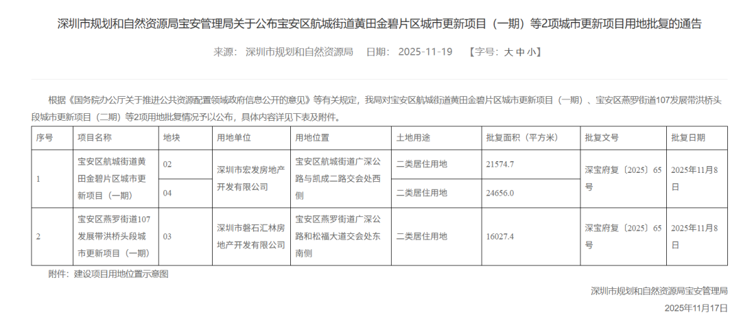 前两日,宝安两个旧改项目用地计划获批,包括黄田金碧片区城市更新项目(一期)用地,以及燕罗街道107发展带洪桥头段城市更新项目(一期),预示着项目即将进入快速开发阶段,共为市场带来约6.3万㎡居住用地。