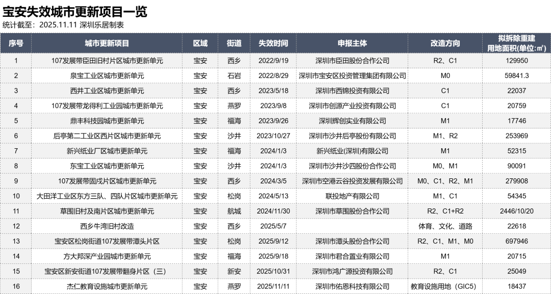 截至2025年11月,宝安区累计已有16个城市更新项目计划失效,接近深圳失效项目的一半数量,仅今年就有5个旧改项目告吹。