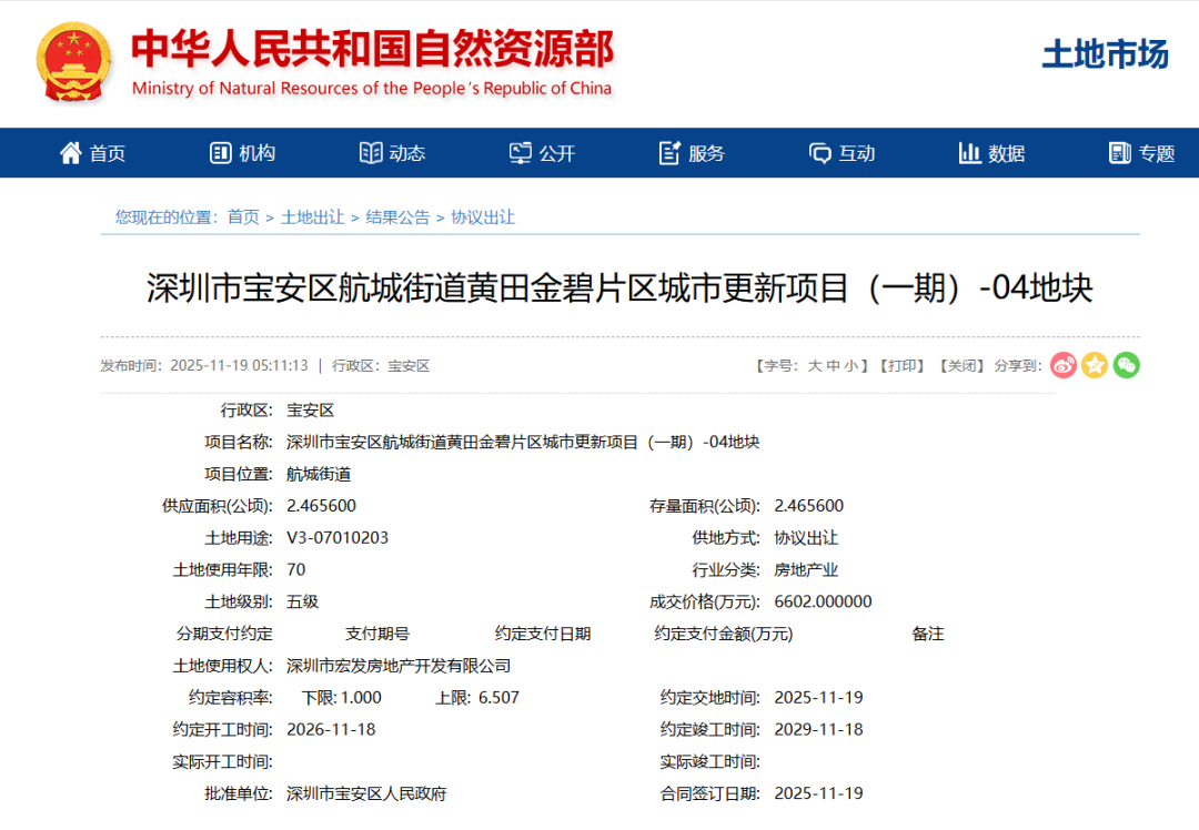 据国家自然资源部公告,黄田金碧片区城市更新项目(一期)-04地块已于2025年11月完成协议出让,土地面积2.47公顷,约定容积率上限为6.507。